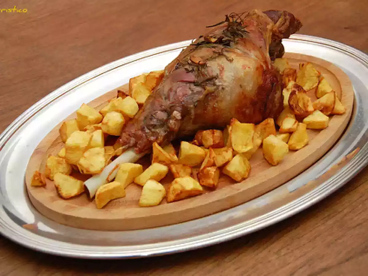 Cosciotto di agnello alla fornaia PrecedenteProssimo Portata principalefacile1 h 15 m Invia questa ricetta ad un amico Stampa la ricetta Contatta l'autore della Ricetta Pubblica la foto di questa ricetta Ingredienti 4 1 cosciotto di agnello di 1,2 kg 600 g di patate tagliate a spicchi 100 g di strutto fresco 2 cipolle di media grandezza, tagliate a fette rosmarino sale e pepe abbondante