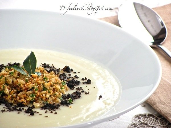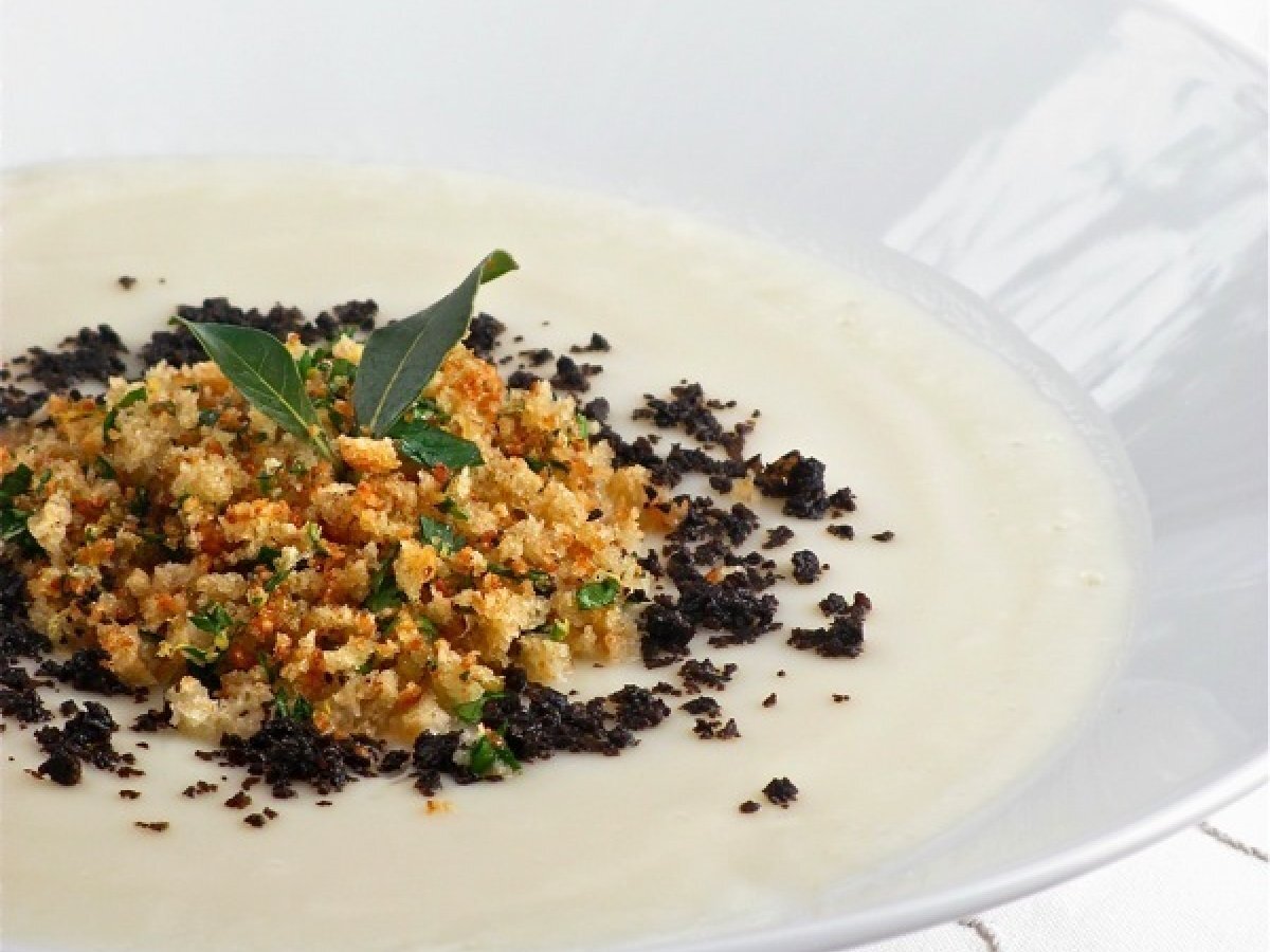Crema di cavolfiore con briciole di pane e polvere di olive