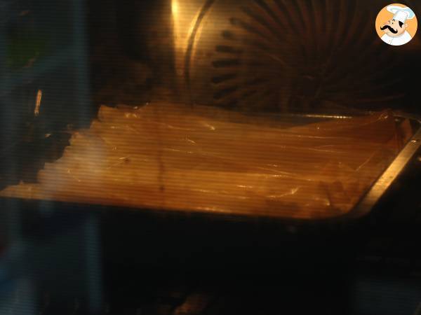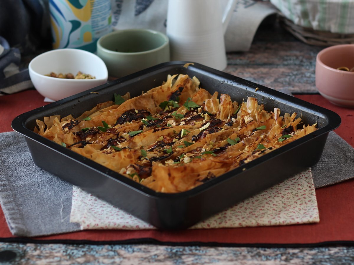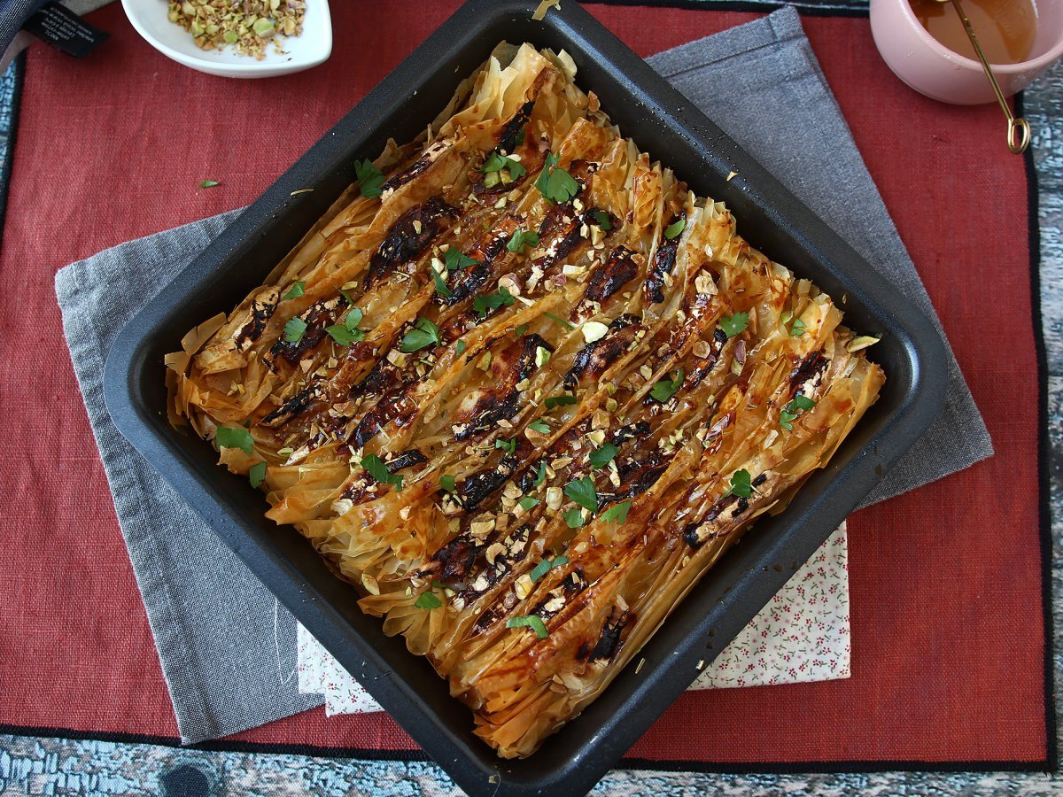Tagliate i fogli di pasta fillo in modo che siano larghi quanto la teglia, quindi piegali su stessi (come in foto)
