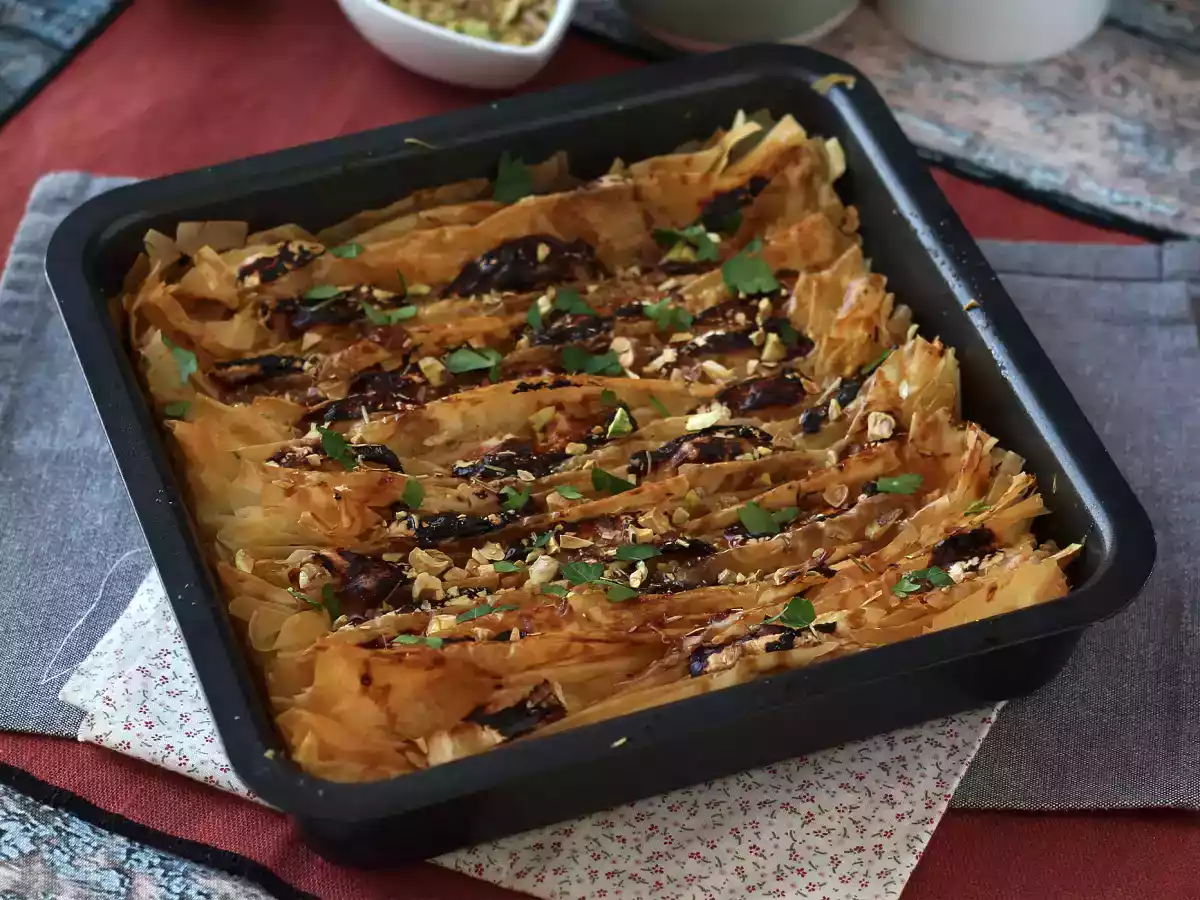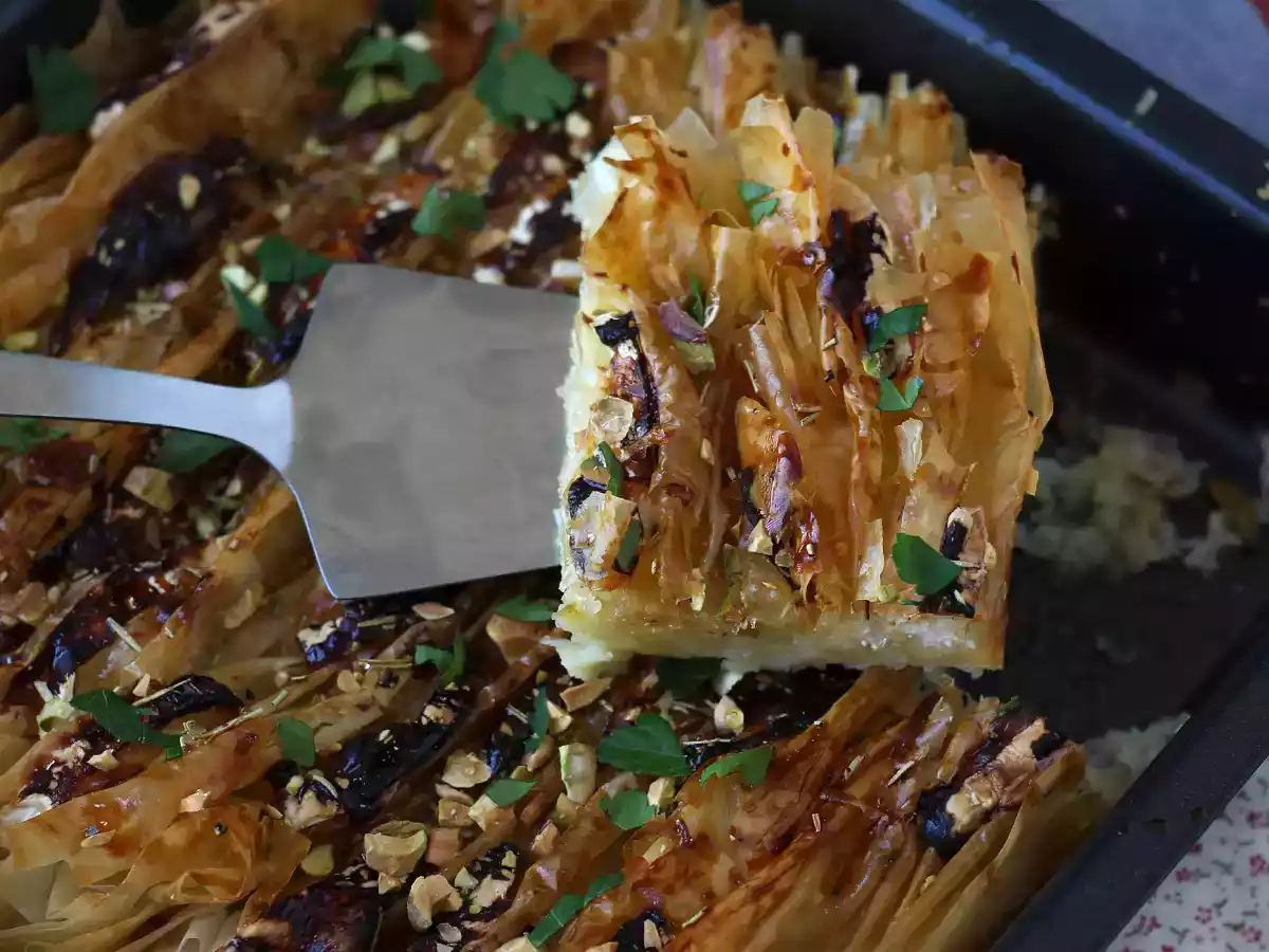 Questa ricetta si prepara con la pasta fillo e quando viene sistemata nello stampo si piega creando delle pieghe irregolari. Durante la cottura in forno diventa croccante e si ottiene una superficie increspata. Molti la chiamano, infatti, anche "torta rugosa"
