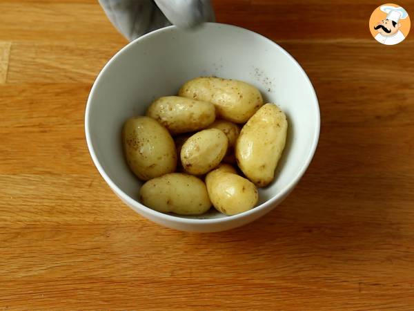 Mettete le patate in una ciotola, aggiungete il sale il pepe ed un filo d'olio. Cuocete al microonde per 8 minuti (potenza massima)