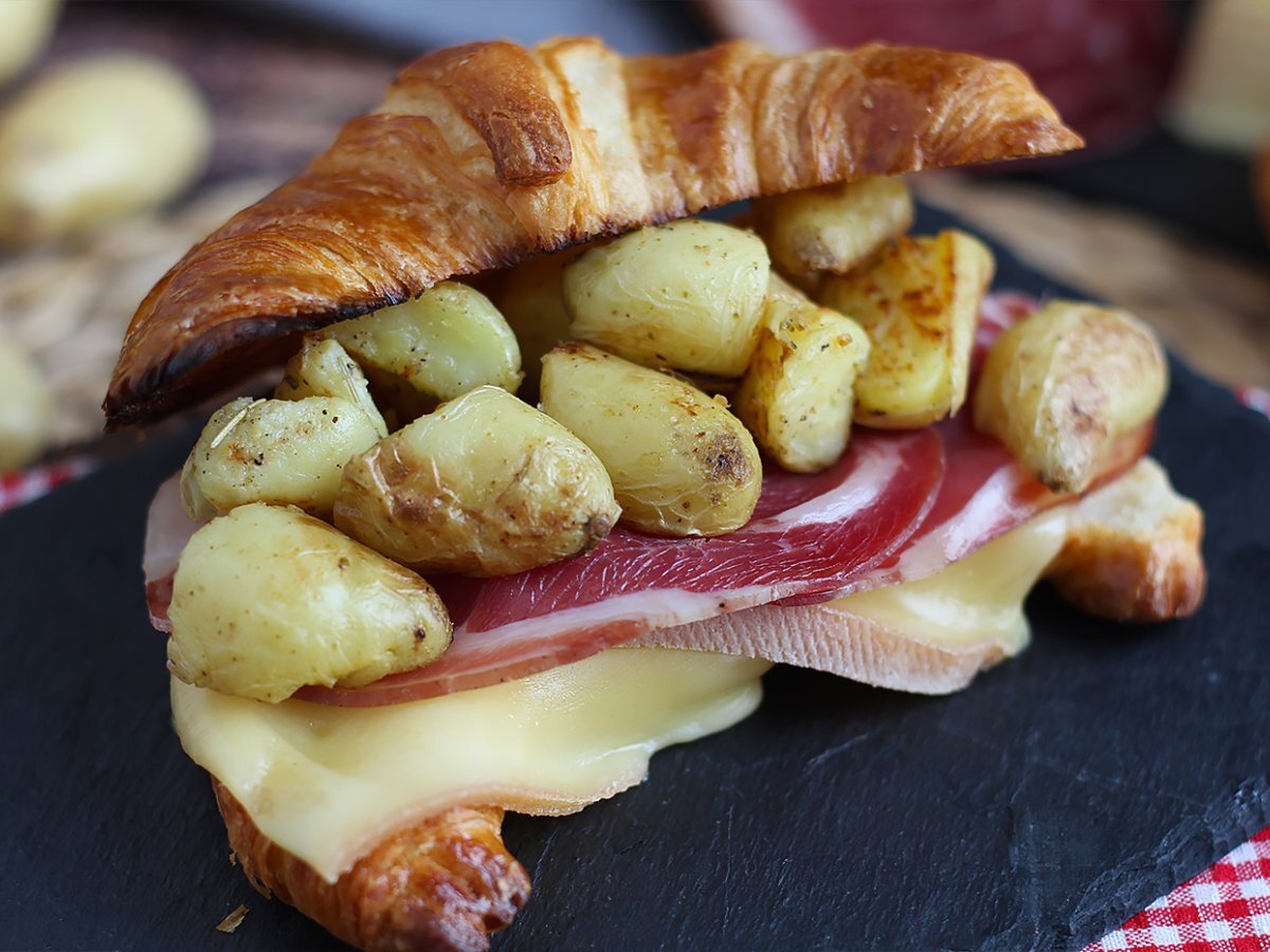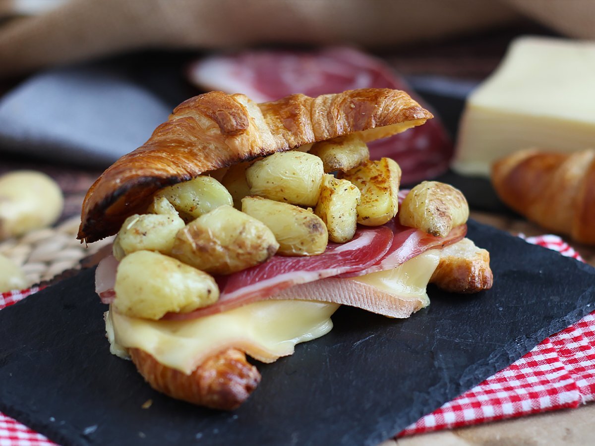 aggiungete le fette di pancetta sul formaggio fuso, poi ricoprite con le patate. Quindi richiudete con la parte superiore del croissant. Pronto!