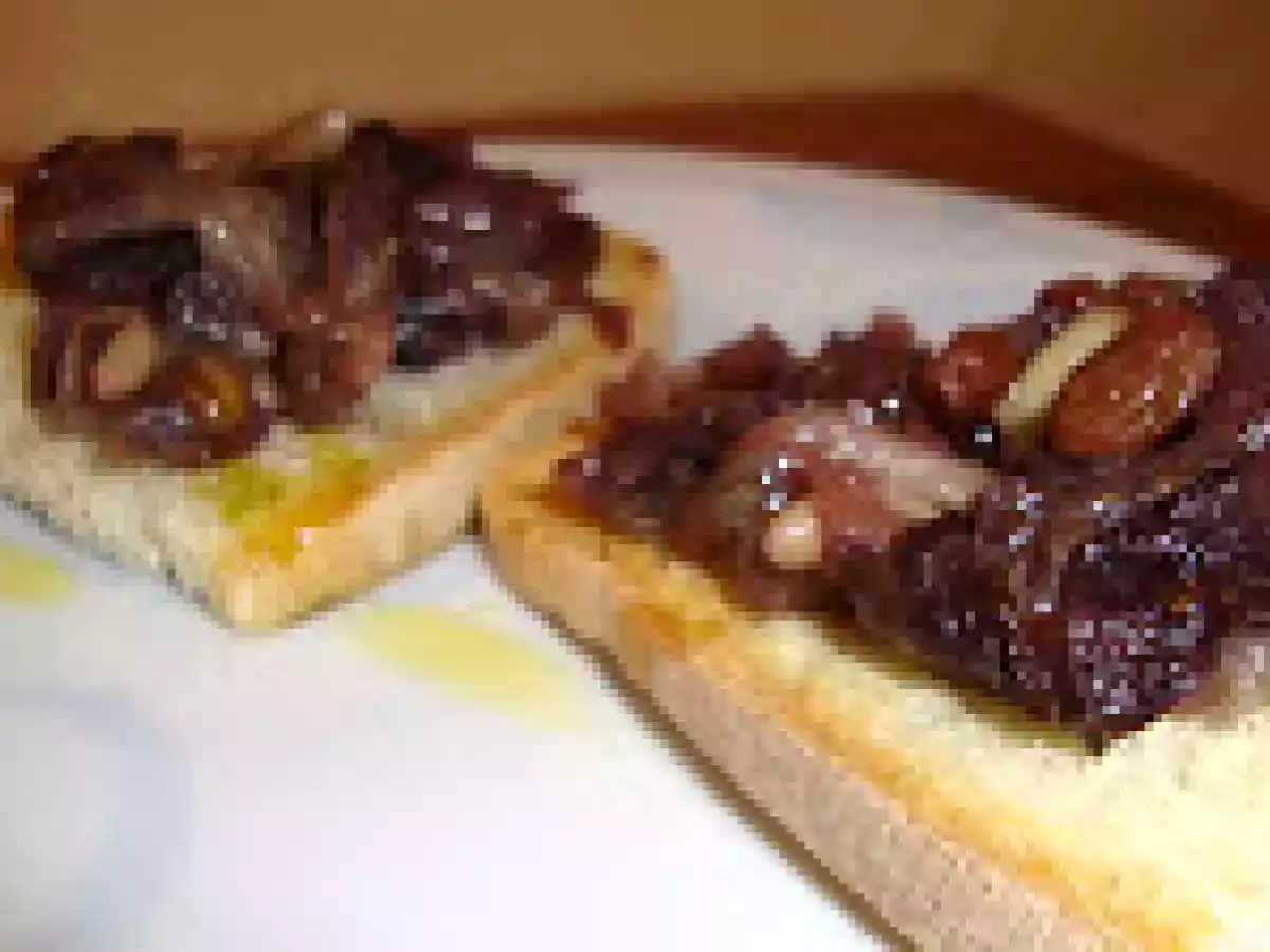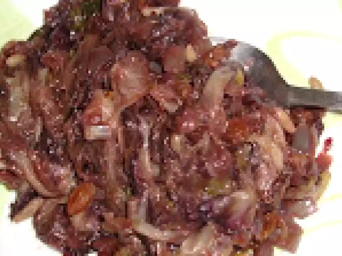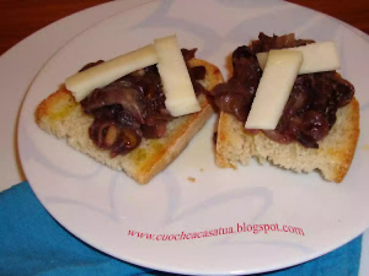 Crostini con radicchio uvetta e pinoli PrecedenteProssimo Portata principalefacile50 min Invia questa ricetta ad un amico Stampa la ricetta Contatta l'autore della Ricetta Pubblica la foto di questa ricetta Ingredienti 2 1 cespo di radicchio rosso a palla ½ cipolla tritata 1 cucchiaio di pinoli 1 manciata di uvetta passa 3 cucchiaini di cannella 1 cucchiaio di olio extra vergine 2 cucchiai di zucchero ½ cucchiaio di miele 4 fette di pane toscano senza sale sale q.b. Formaggio pecorino di Pienza 16 pezzetti sottili di 1 cm per 2,5 cm