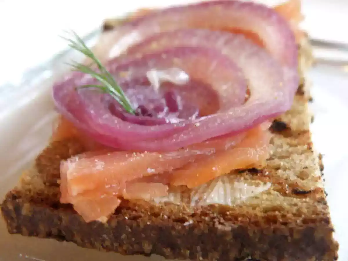 Crostini neri di salmone e cipolla di tropea