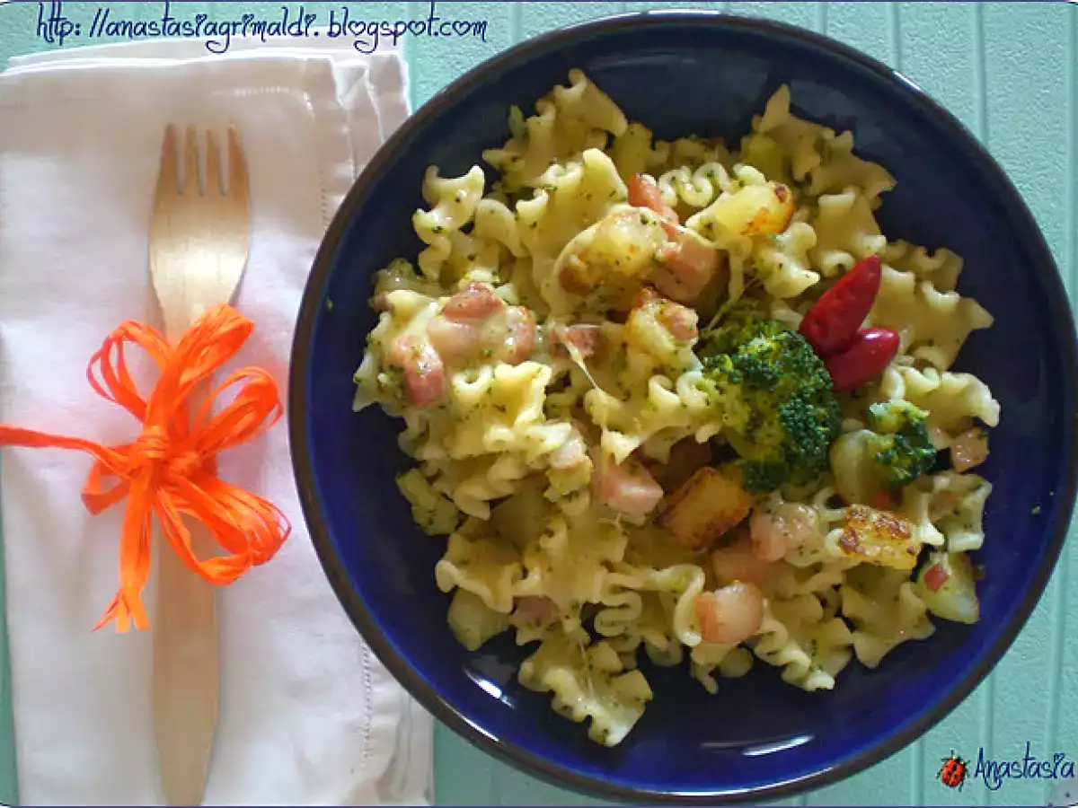 Da casa barilla: mafalde napoletane con pancetta broccolo patate e scamorza Portata principalefacile1 ora155 Kcal Invia questa ricetta ad un amico Stampa la ricetta Contatta l'autore della Ricetta Pubblica la foto di questa ricetta Ingredienti 4 Ingredienti: 100 gr di pancetta a dadini 1 patata non troppo grossa 1/2 cipolla rossa 1 pezzetto di scamorza affumicata broccolo peperoncino olio sale e pepe Costo stimato: 1.94Euros€ (0.48€/Porzioni)