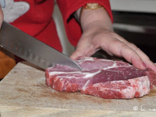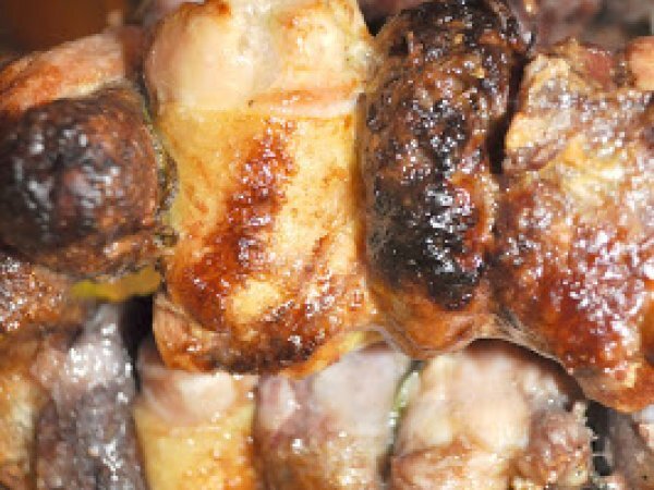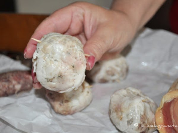 Tagliare il matamà in pezzi. - Questi sono fegatini, pallotte di fegato di maiale, avvolte nella retina. Sono una bontà, se il vostro macellaio non le prepara, fatevele.