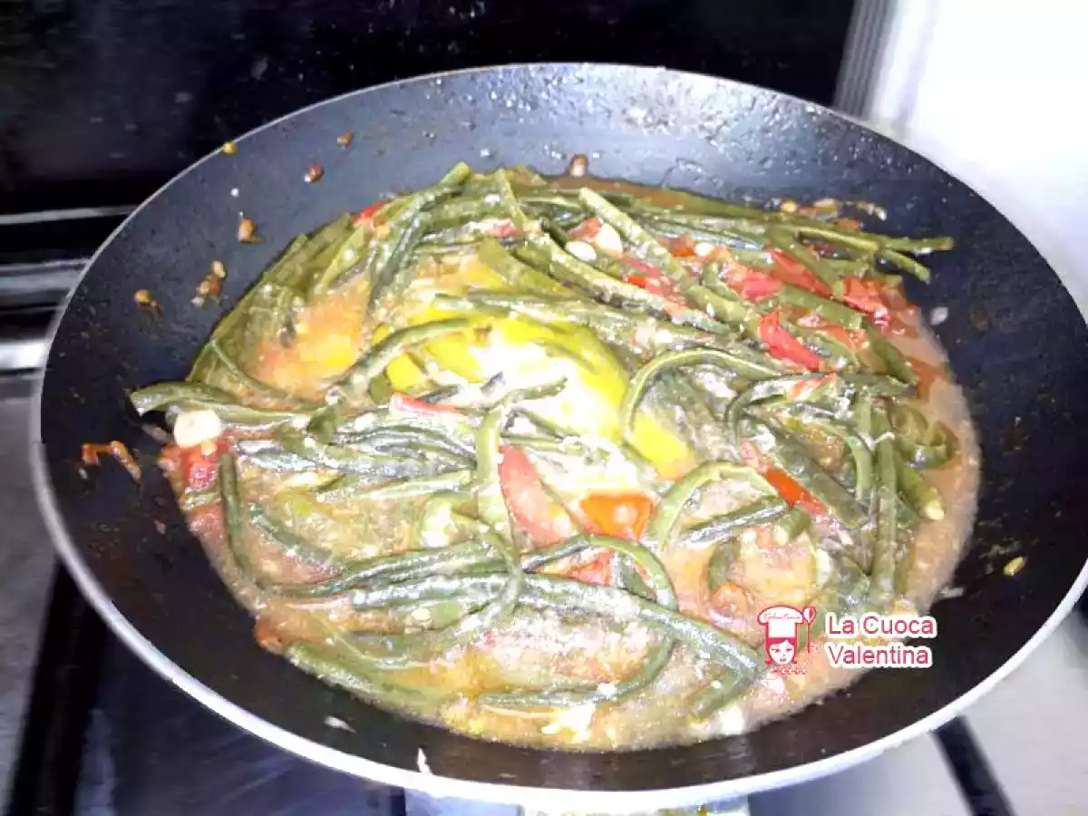 Vi sono avanzati fagiolini? Oggi prepariamo un piatto unico a base di fagiolini, pomodori e uova. Questo piatto completo è ricco di proteine e vitamine. Dopo aver soffritto i pomodori, si aggiungono i fagioli e alla fine le uova, che verranno cotte con un coperchio.