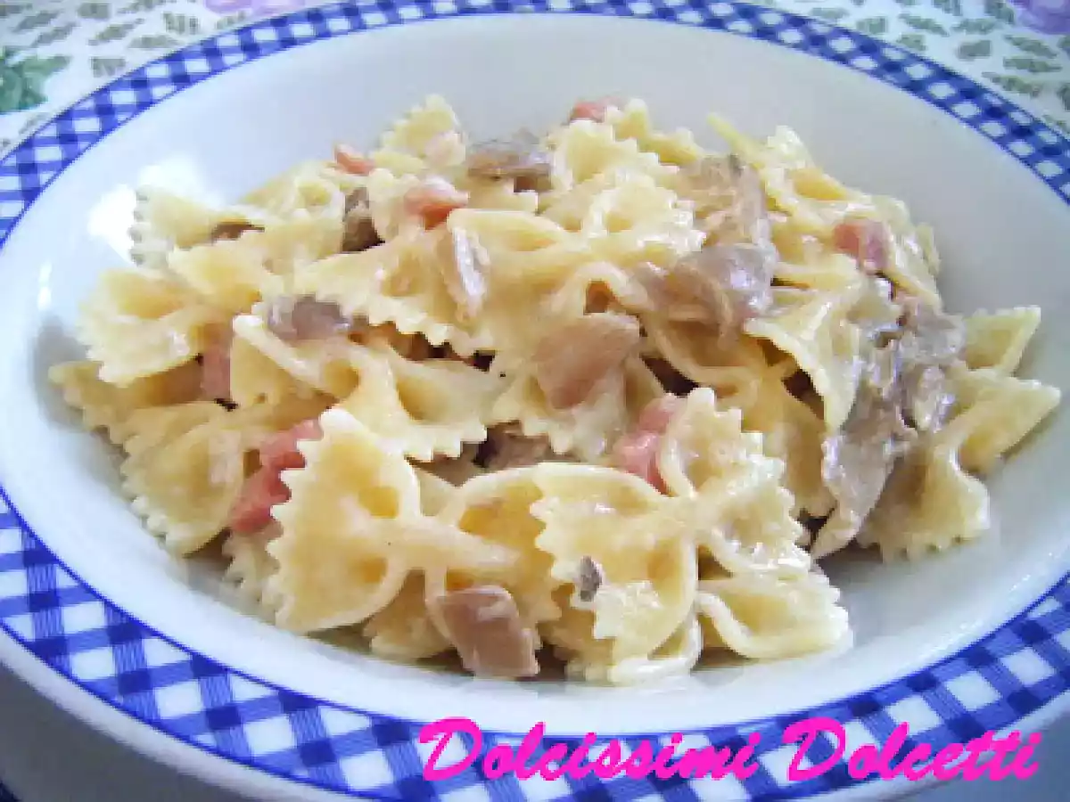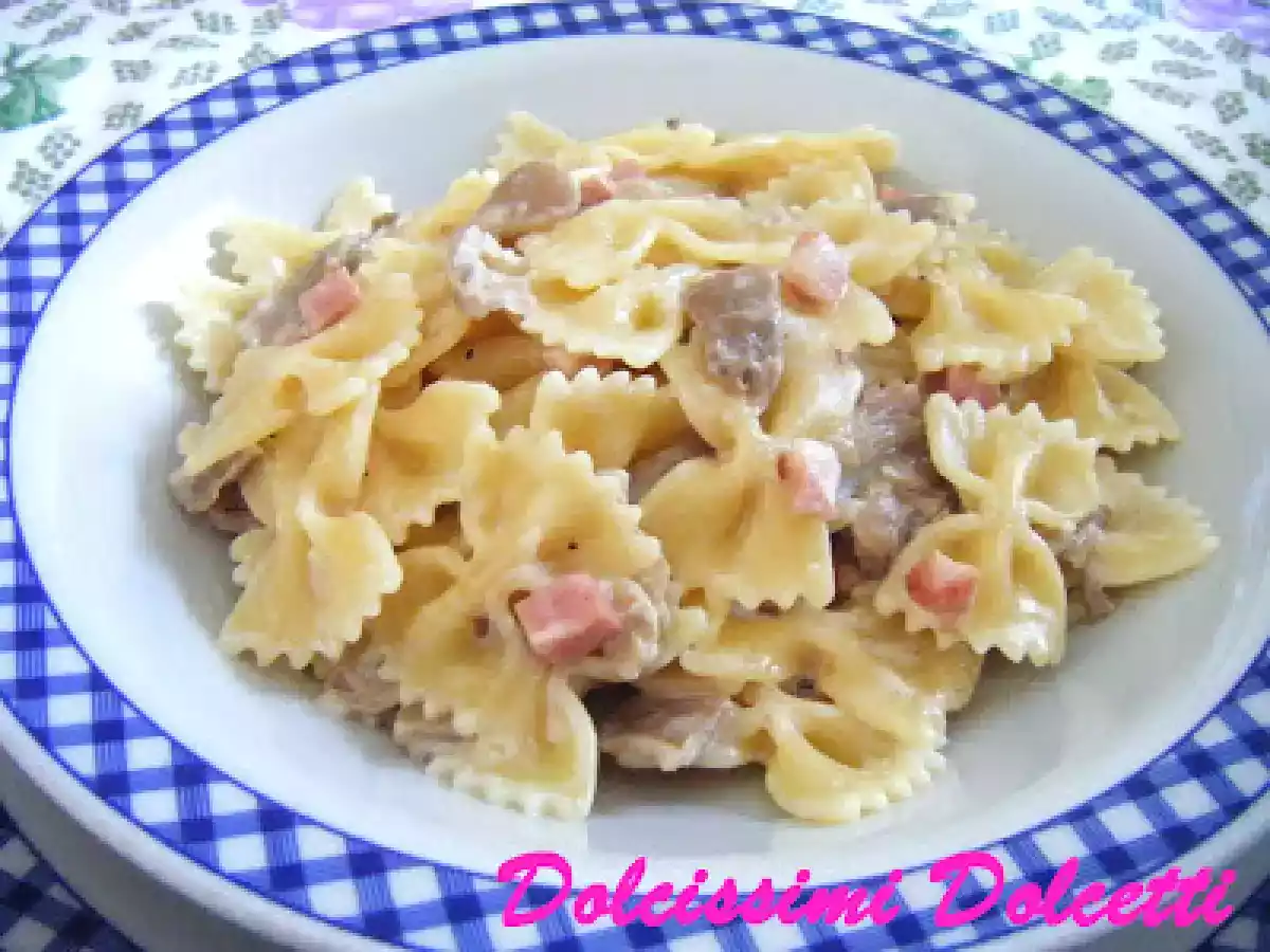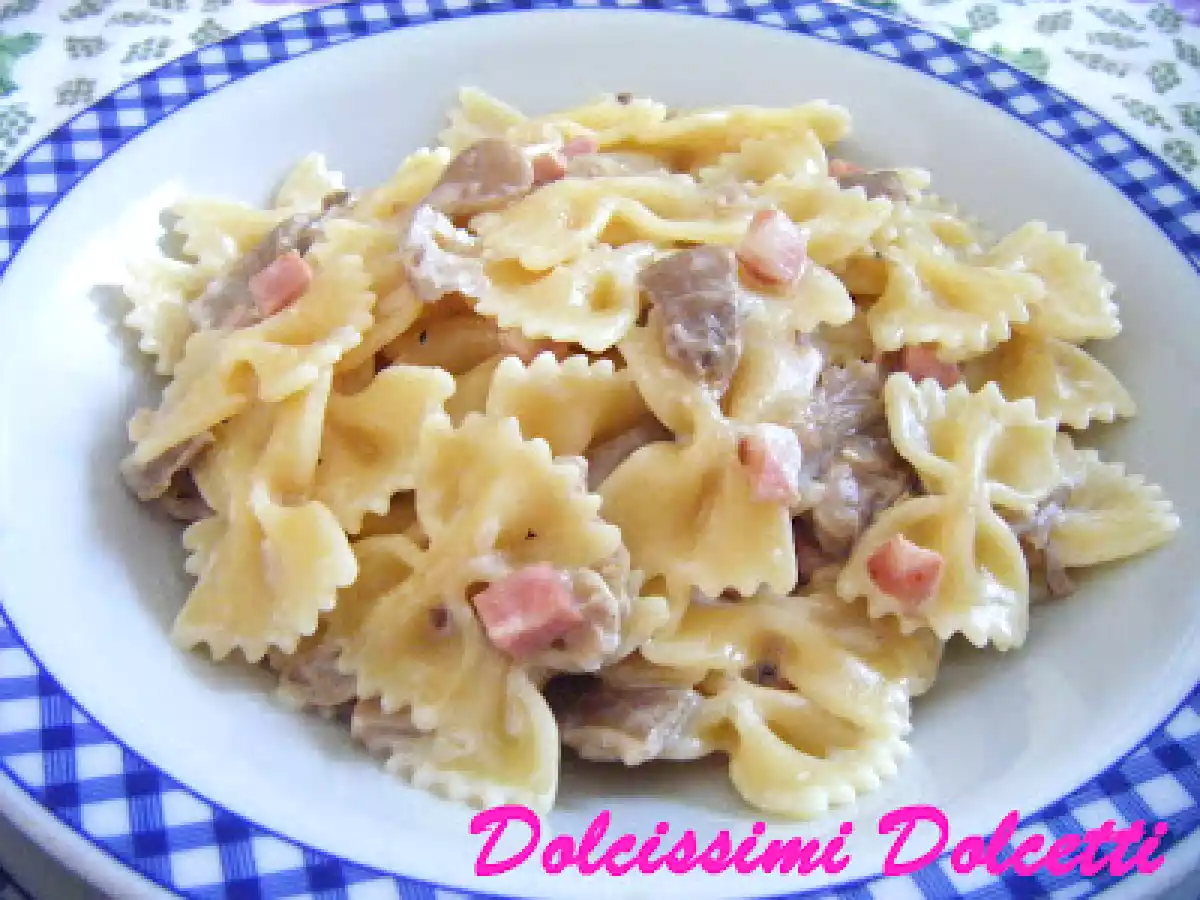 Farfalle ai funghi e mortadella PrecedenteProssimo Portata principalefacile35 min575 Kcal Invia questa ricetta ad un amico Stampa la ricetta Contatta l'autore della Ricetta Pubblica la foto di questa ricetta Ingredienti 5 500 g di farfalle 250 g di funghi pleurotus 100 g di mortadella a cubettini 30 g di burro 100 ml di panna 30 g di parmigiano grattugiato pepe nero sale Costo stimato: 5.2Euros€ (1.04€/Porzioni)