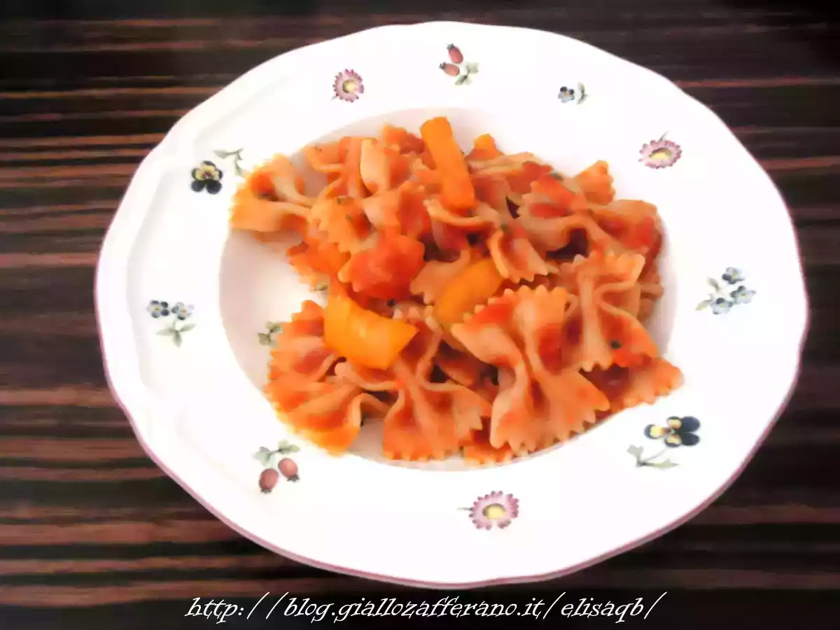 Le farfalle ai peperoni sono un primo piatto molto facile da preparare. L’ho preparato occasione di un prazo domenicale, devo dire che la mia carissima nonna ha gradito molto, e non solo per quanto riguarda il sapore ma anche i colori l’hanno attratta! Insomma se la nonna ha gradito vuol dire che il piatto è riuscito bene … no?!?!