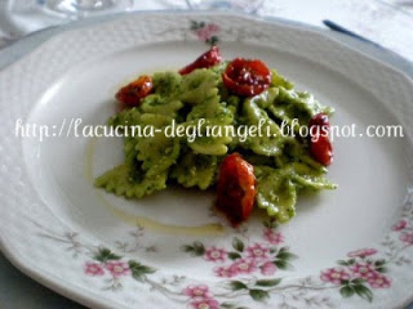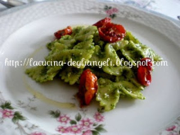 Farfalle al pesto di rucola con pomodori confit vota adesso PrecedenteProssimo Portata principalefacile1 h 30 m Invia questa ricetta ad un amico Stampa la ricetta Contatta l'autore della Ricetta Pubblica la foto di questa ricetta Ingredienti 4 120 g di rucola 50 g di pecorino romano 50 g di parmigiano 50 g di pinoli 150 g di olio EVO 1/4 di spicchio d'aglio 20 pomodorini cirietto origano secco Q.b. 300 g di farfalle zucchero semolato Q.b. Olio EVO Q.b. Sale e pepe Q.b.