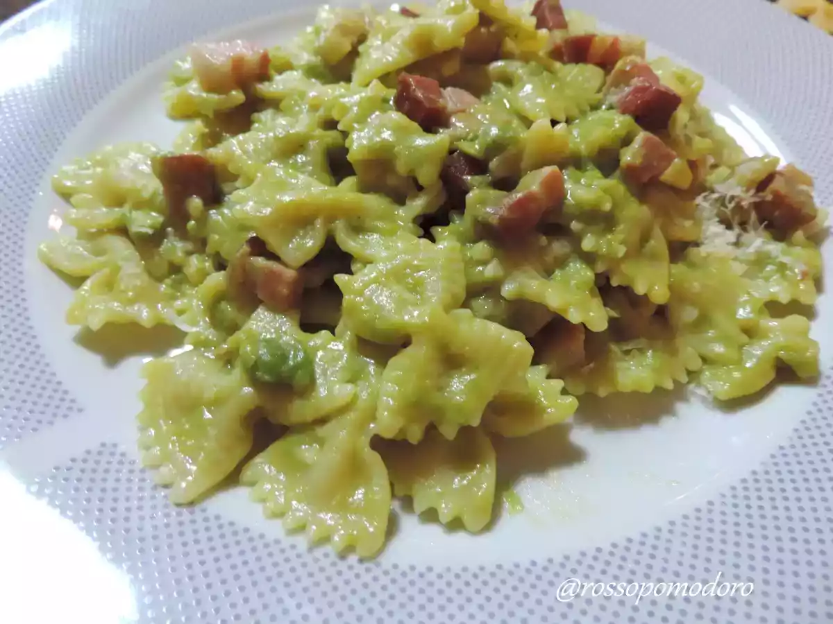 Farfalle con crema di piselli e pancetta