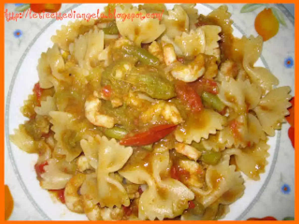 Farfalle con gamberi e asparagi selvatici. Portata principalefacile40 min477 Kcal Invia questa ricetta ad un amico Stampa la ricetta Contatta l'autore della Ricetta Pubblica la foto di questa ricetta Ingredienti 4 400 g di farfalle 300 g di gamberetti sgusciati 200 g di asparagi selvatici 300 g di pomodorini 1 cipollina 1 ciuffo di basilico olio extravergine d'oliva sale, pepe