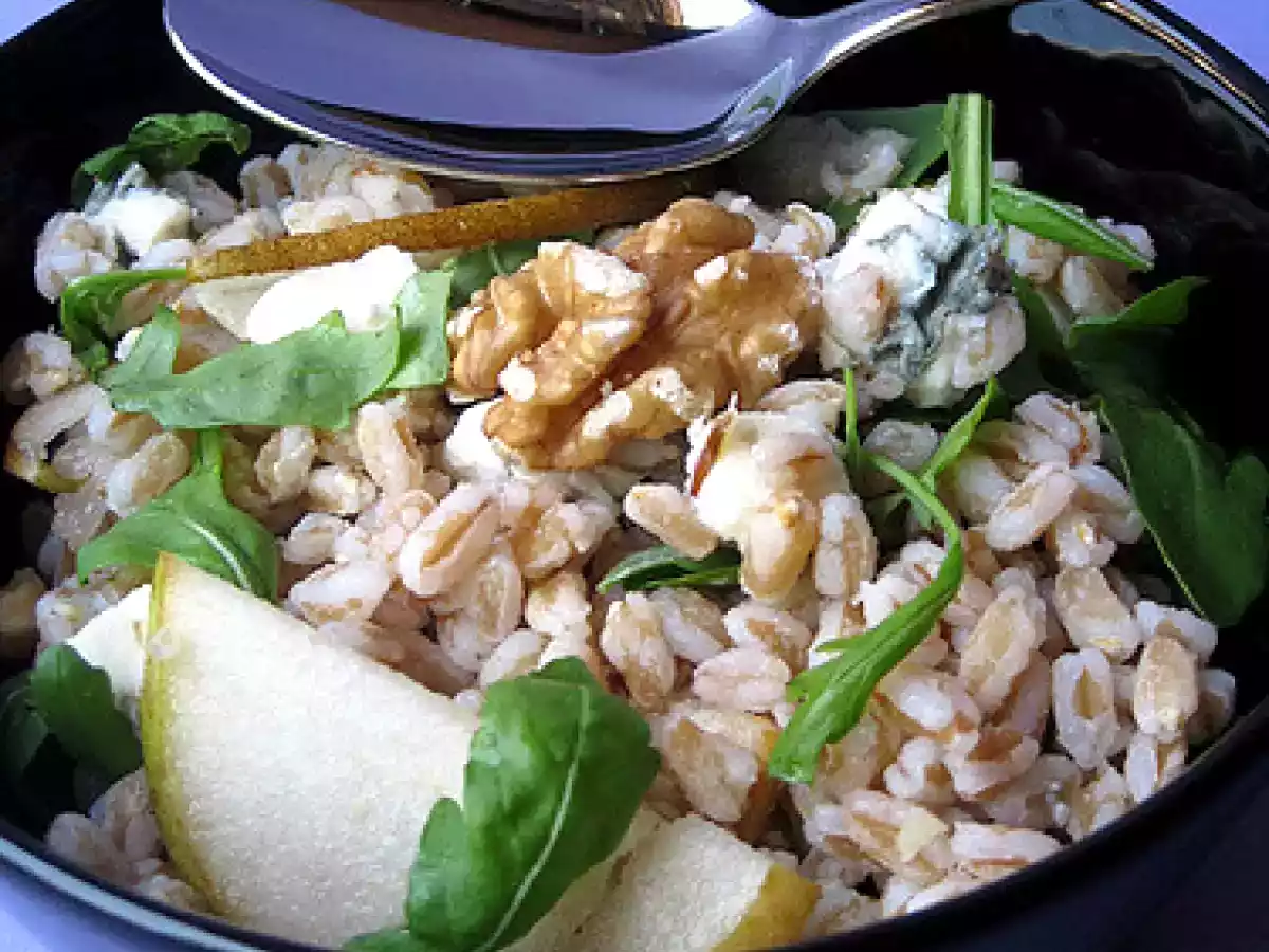 Farro con rucola, pere, gorgonzola, noci e salsa al miele