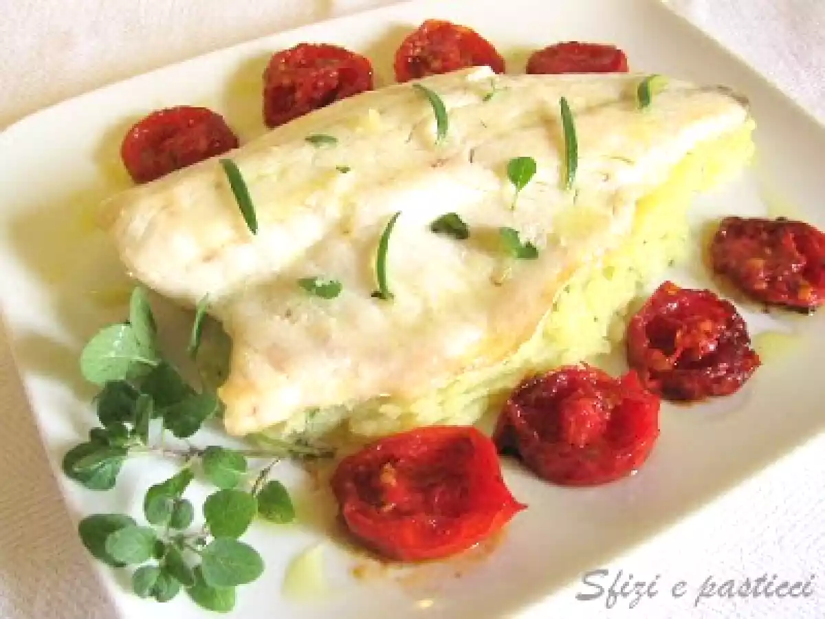 Filetti di branzino con patate agli aromi e pomodorini