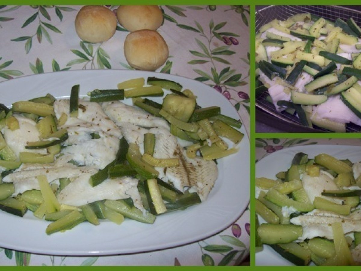 Filetti di platessa al semi-vapore su letto di zucchine PrecedenteProssimo Portata principalefacile20 min Invia questa ricetta ad un amico Stampa la ricetta Contatta l'autore della Ricetta Pubblica la foto di questa ricetta Ingredienti 4 filetti di platessa; 3 zucchine; 1/2 cucchiaio olio evo; origano