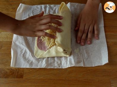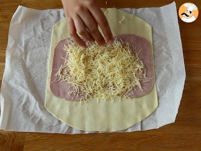 Srotolate la pasta sfoglia e tagliate due strisce dai bordi (conservatele perché ci serviranno più tardi). Collocate le due fette di prosciutto sulla superficie e spolverate con l'emmental grattugiato.