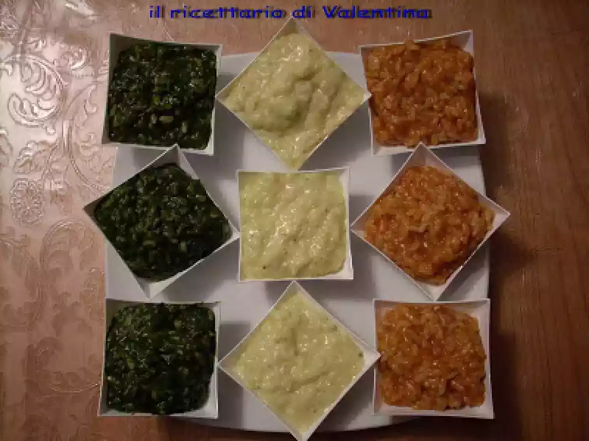 Finger food tricolore in risotto vota adesso Portata principalefacile40 min Invia questa ricetta ad un amico Stampa la ricetta Contatta l'autore della Ricetta Pubblica la foto di questa ricetta Ingredienti 6 burro cipolla bianca tritata brodo riso vino bianco parmigiano grattugiato sugo semplice spinaci cotti e strizzati latte pepe sale noce moscata