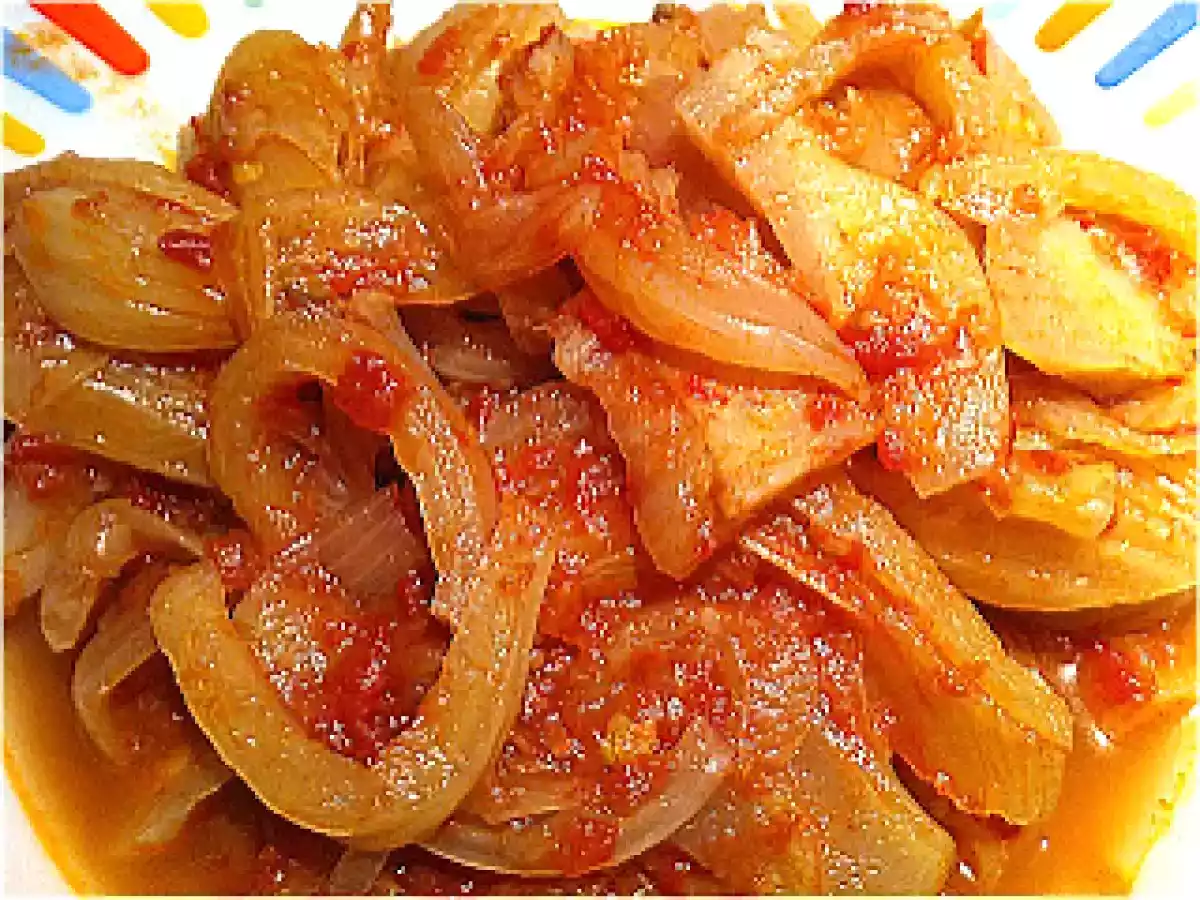 - Nel frattempo tagliate la cipolla a fettine e rosolatela nell'olio aggiungete il pomodoro e fatelo cuocere, infine aggiungete il finocchio.