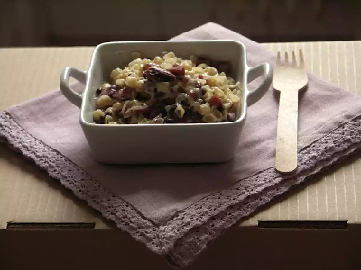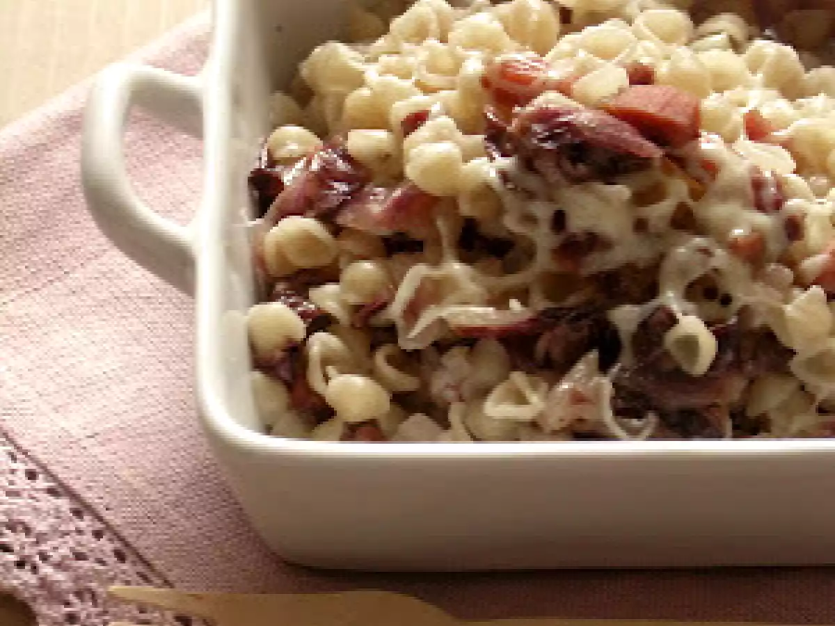Finto-risotto di pastina al radicchio, speck ed emmental vota adesso PrecedenteProssimo Portata principalefacile35 min Invia questa ricetta ad un amico Stampa la ricetta Contatta l'autore della Ricetta Pubblica la foto di questa ricetta Ingredienti 2 un po' d'olio uno scalogno uno spicchio d'aglio mezza fetta spessa di speck 4 grosse foglie di radicchio rosso acqua 90 g di pasta piccola
