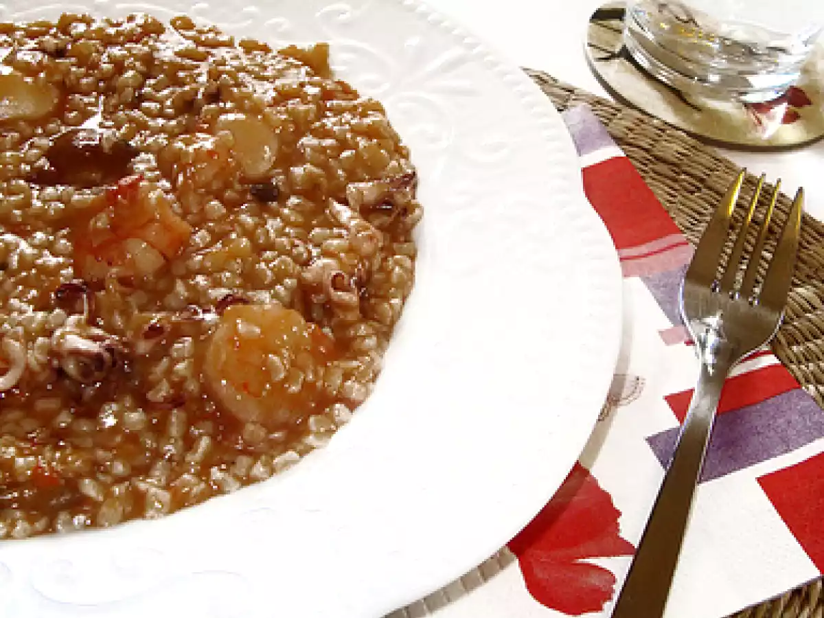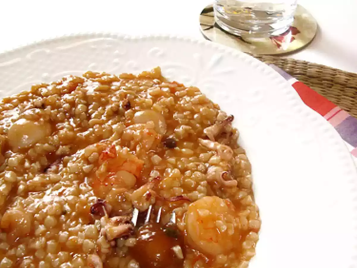 Fregola risottata con frutti di mare e funghi PrecedenteProssimo Portata principalefacile50 min Invia questa ricetta ad un amico Stampa la ricetta Contatta l'autore della Ricetta Pubblica la foto di questa ricetta Ingredienti 2 140 gr di fregola 1 dado di pesce 1 spicchio d?aglio 1 cucchiaio di farina ½ bicchiere di vino bianco 300 gr di frutti di mare 4-5 funghi Uno o due cucchiai di passata di pomodoro Olio, prezzemolo q.b.