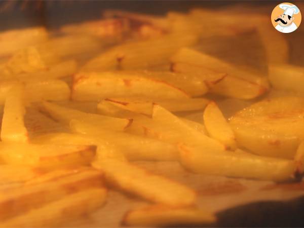 Prepariamo le patatine: Pelare e tagliare le patate a bastoncini. Mescolatele con olio di oliva e sale, quindi adagiatele su una teglia ricoperta da carta da forno. Infornate per 20 minuti a 220° C.