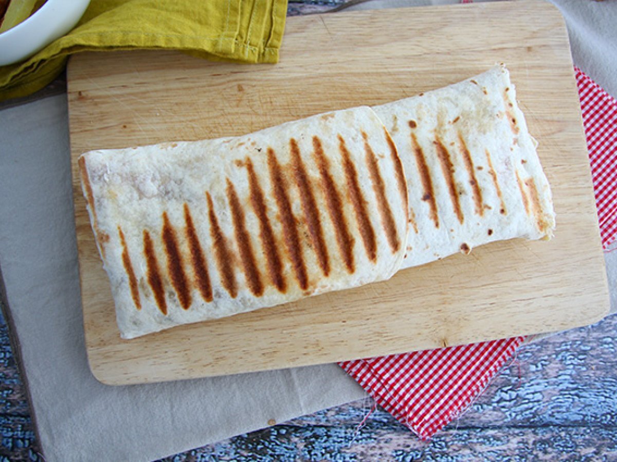 A questo punto girate il tacos e piastratelo per minuti (se non avete la piastre passatelo in padella, 3 minuti per lato cominciando dal lato aperto per sigillarlo)