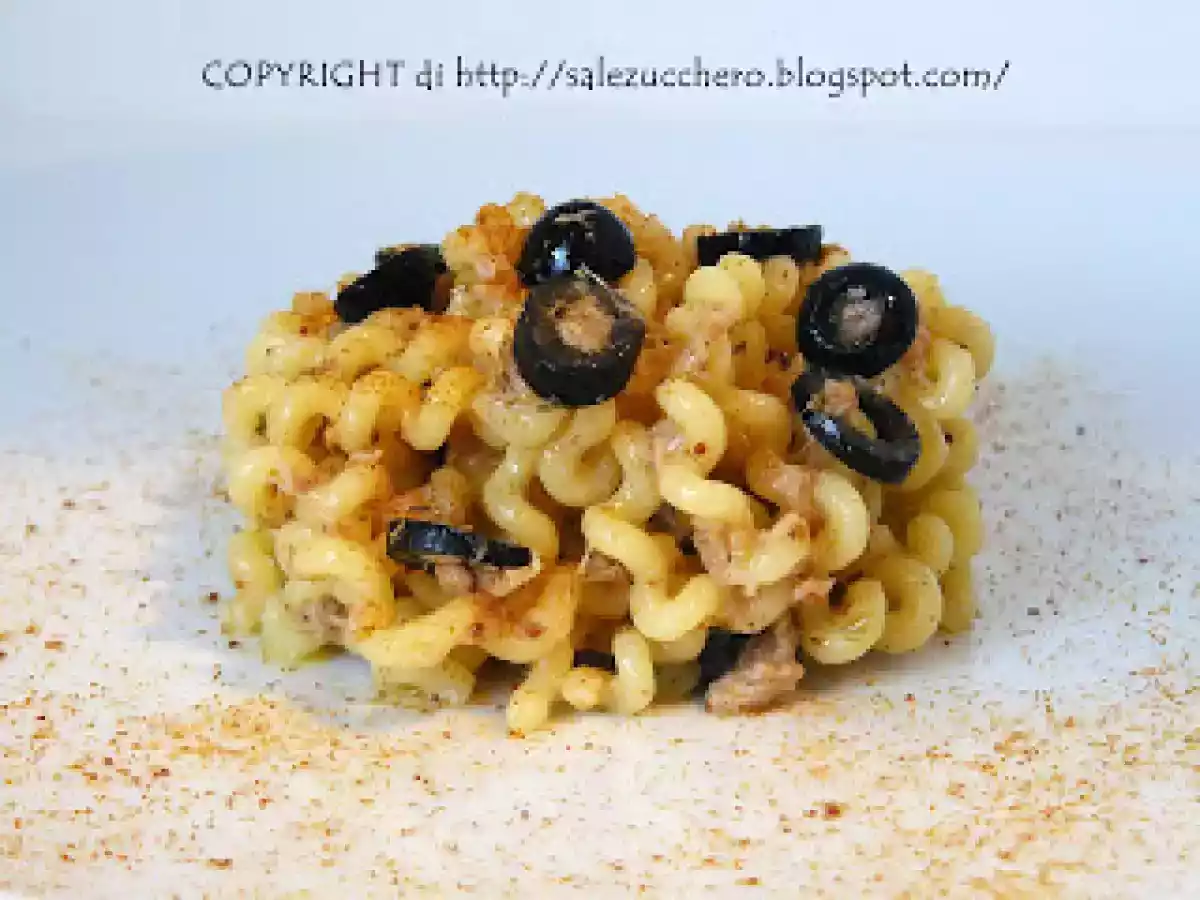Fusilli lunghi campani. tonno, olive, bottarga Portata principalefacile40 min919 Kcal Invia questa ricetta ad un amico Stampa la ricetta Contatta l'autore della Ricetta Pubblica la foto di questa ricetta Ingredienti 4 320 g di fusilli lunghi campani 250 g di tonno all'olio extravergine d'oliva 80 g di olive nere 2 cucchiai di bottarga 1 spicchio d'aglio Sale pepe olio extravergine di oliva quanto basta