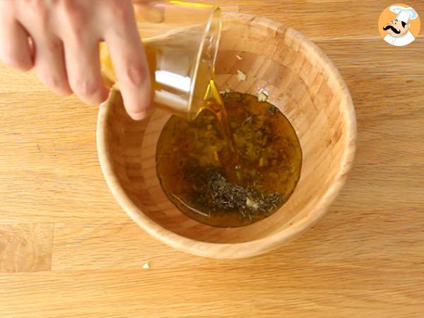 In una ciotola schiacciate gli spicchi di aglio e aggiungete l'olio, il sale e le erbe aromatiche; quindi mescolate per bene.