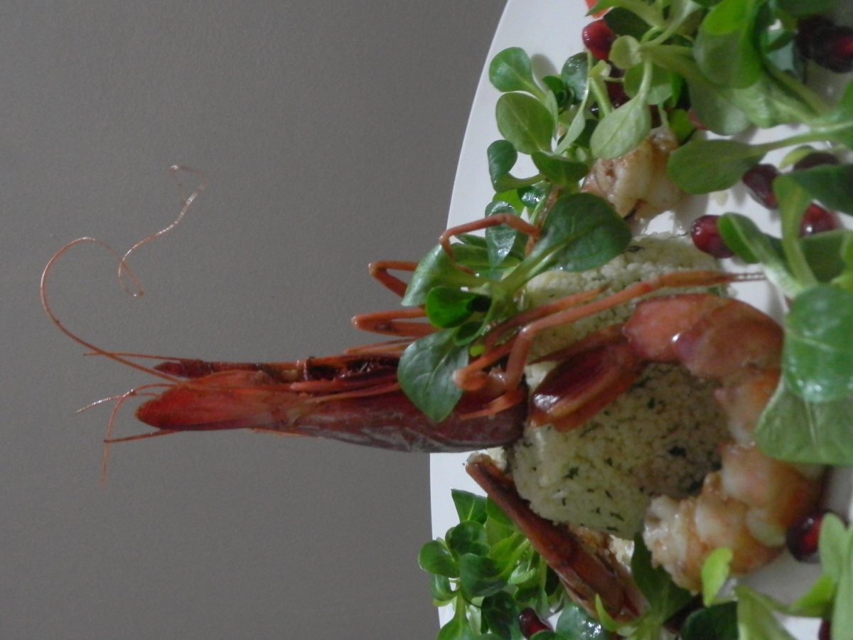 Gamberoni al melograno con il cous cous profumato alla menta Portata principalemedia5 h 20 m Invia questa ricetta ad un amico Stampa la ricetta Contatta l'autore della Ricetta Pubblica la foto di questa ricetta Ingredienti 4 12 Gamberoni 2 Melograno g 240 Cous Cous 1 ciuffo Menta ml 50 Vodka 1 Scalogno 1 spicchio Aglio q.b Olio d?Oliva Extra Vergine q.b Sale q.b Pepe