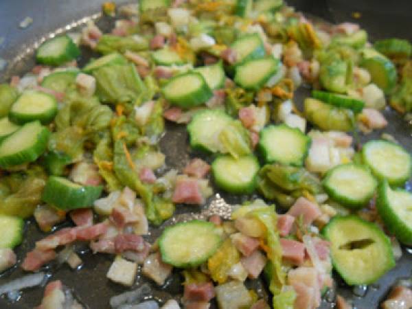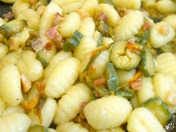 Gnocchi alla "zia bene" con salsa allo zafferano Portata principalefacile55 min Invia questa ricetta ad un amico Stampa la ricetta Contatta l'autore della Ricetta Pubblica la foto di questa ricetta Ingredienti 5 500 g di gnocchi di patate 2 zucchine medie 5 o 6 fiori di zucchina una confezione di pancetta a cubetti mezza cipolla 40 g di burro 10 g di farina 1 bustina di zafferano 1 tazza di brodo di pollo vino bianco sale e pepe q.b.