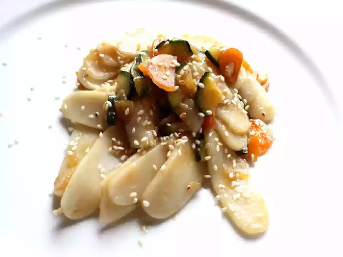 Gnocchi di riso saltati con verdure PrecedenteProssimo Portata principalefacile35 min Invia questa ricetta ad un amico Stampa la ricetta Contatta l'autore della Ricetta Pubblica la foto di questa ricetta Ingredienti 2 200 g di gnocchi di riso 1 zucchina 1 carota mezza cipolla bianca 2 cm di radice di zenzero fresco un cucchiaio di olio di semi di girasole 1 cucchiaio di mirin 2 cucchiaio di salsa di soia sale una manciata di semi di sesamo tostati in un padellino