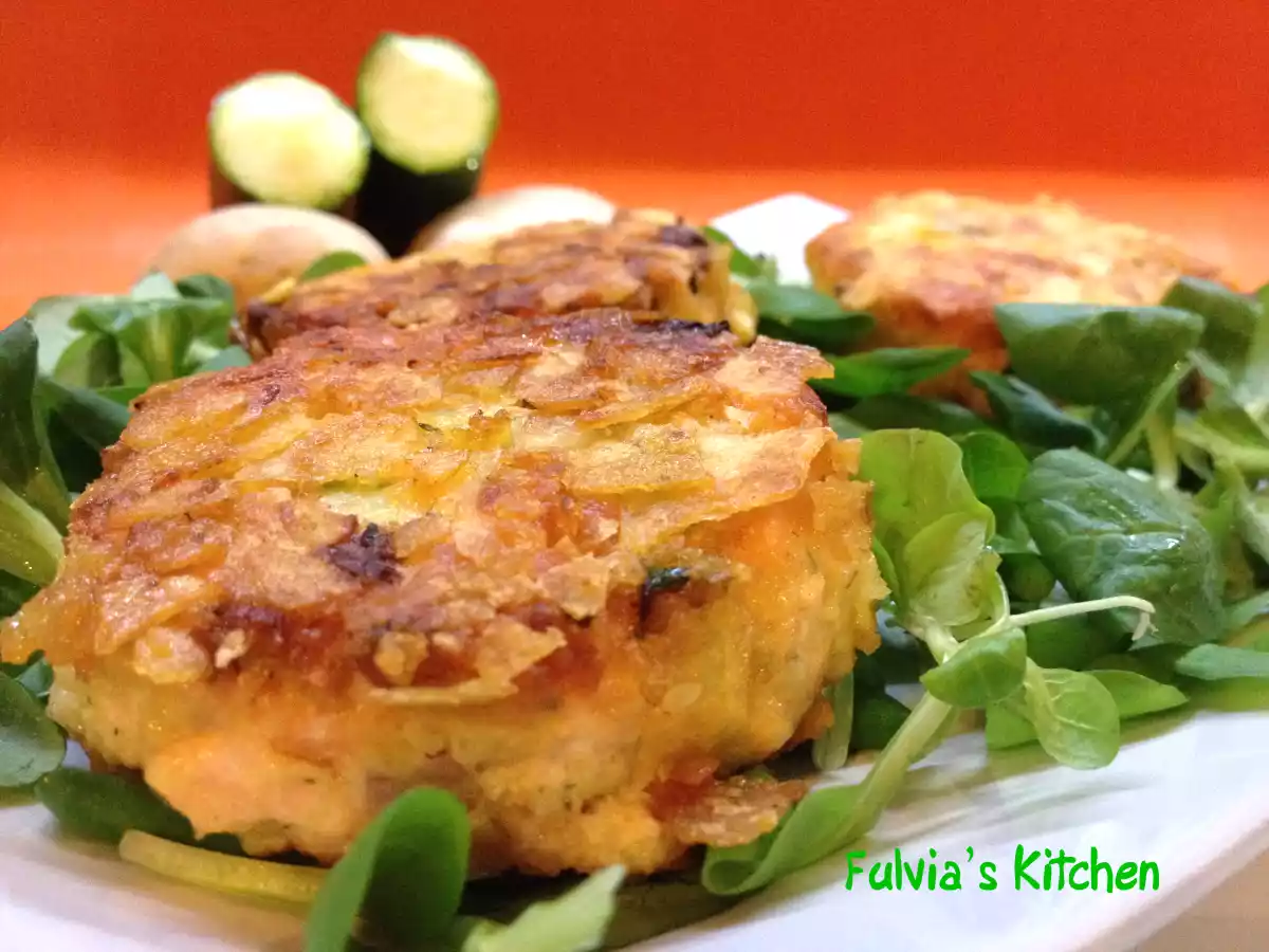 Se cercate un modo favoloso per far mangiare ai vostri bimbi verdure e pesce, eccovi accontentati... In questi succulenti hamburger ricoperti di patatine croccantissime, si nascondono, oltre ovviamente al salmone, anche delle zucchine e delle patate... Cosa si può chiedere di più ad un piatto? :-)