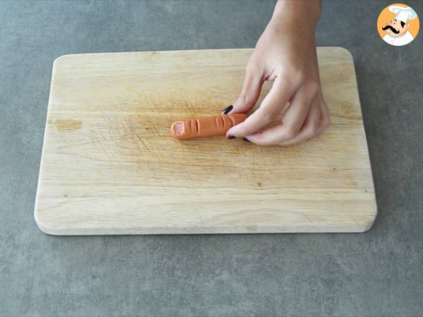 Tagliate i wurstel a metà. Poi fate delle piccole incisioni sulla superficie: 3 dalla parte tagliata, 2 dall'altra parte. (guardate il video tutorial a fondo pagina per capire meglio)