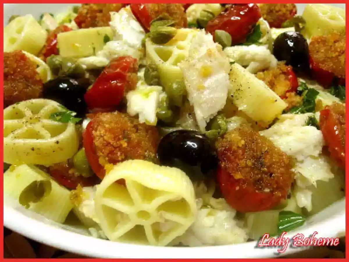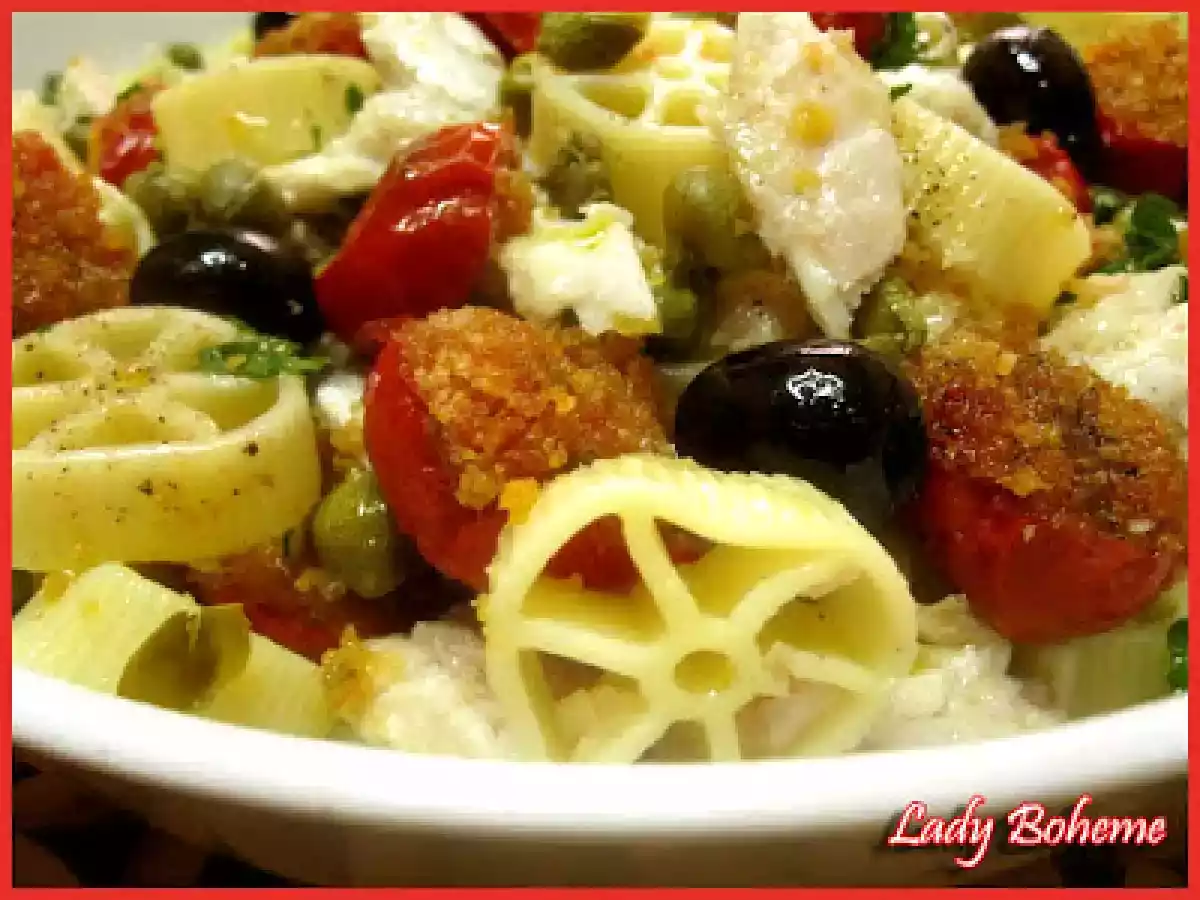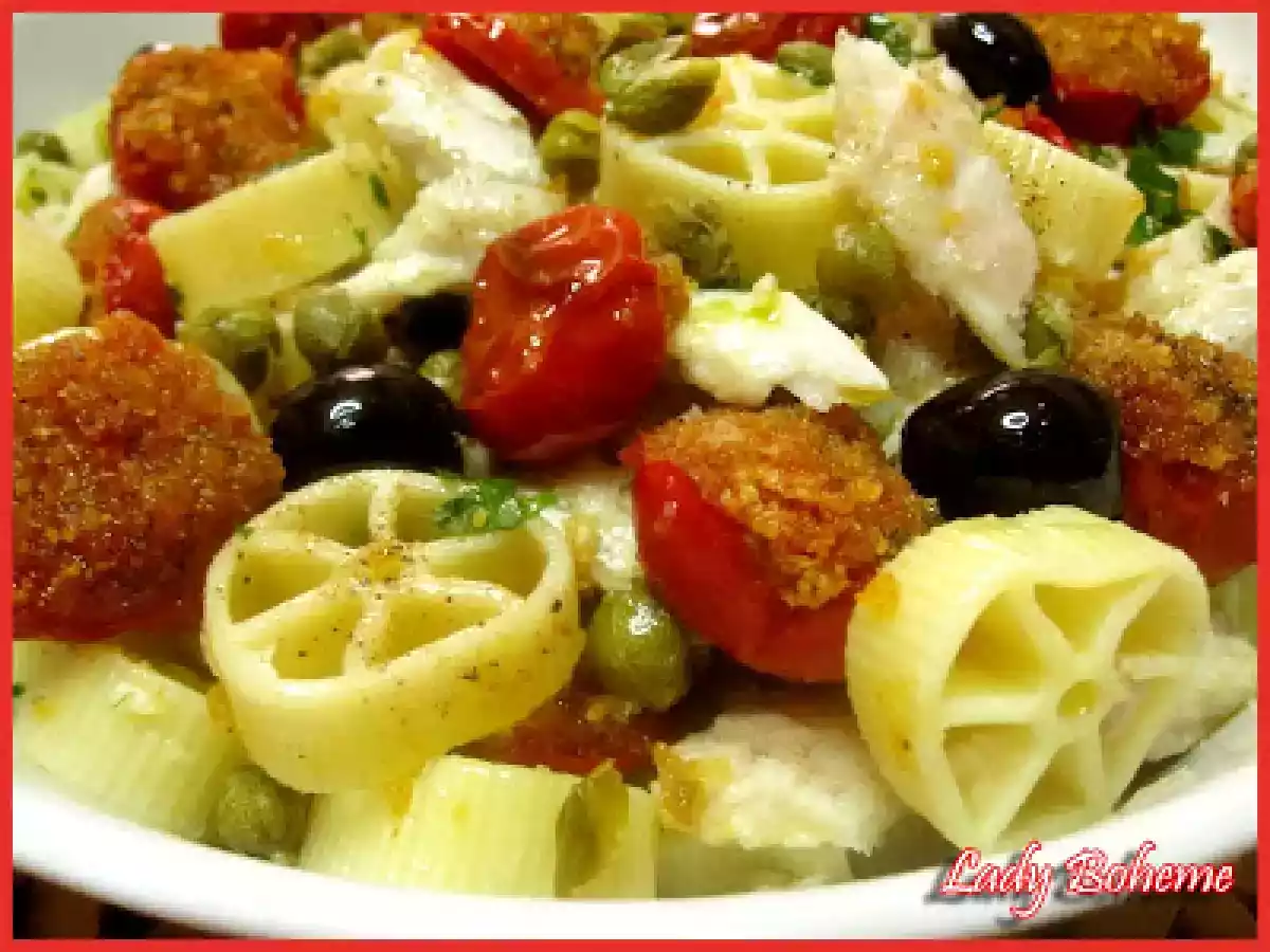 Il fascino del bosco e la pasta fredda: "rotelle picnic" vota adesso PrecedenteProssimo Portata principalefacile35 min Invia questa ricetta ad un amico Stampa la ricetta Contatta l'autore della Ricetta Pubblica la foto di questa ricetta Ingredienti 4 350 g di rotelle 300 g di pomodorini 300 g di filetti di pesce persico 100 g di olive nere denocciolate capperi prezzemolo tritato 1 spicchio di aglio pane grattato sale e pepe nero olio evo