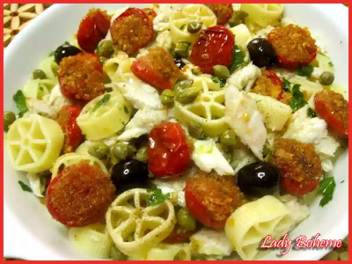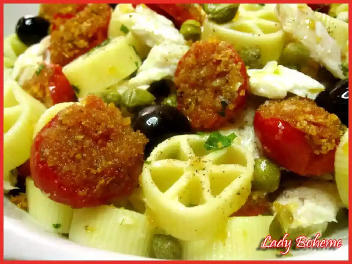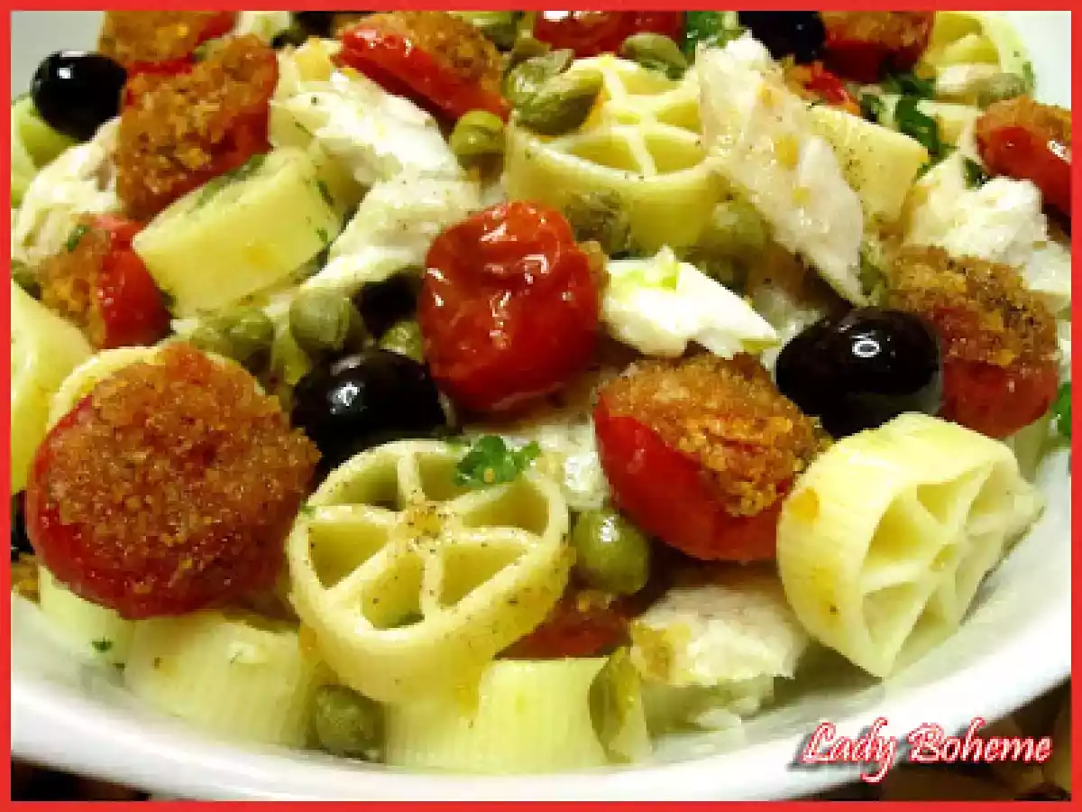 Il fascino del bosco e la pasta fredda: "rotelle picnic" vota adesso PrecedenteProssimo Portata principalefacile35 min Invia questa ricetta ad un amico Stampa la ricetta Contatta l'autore della Ricetta Pubblica la foto di questa ricetta Ingredienti 4 350 g di rotelle 300 g di pomodorini 300 g di filetti di pesce persico 100 g di olive nere denocciolate capperi prezzemolo tritato 1 spicchio di aglio pane grattato sale e pepe nero olio evo