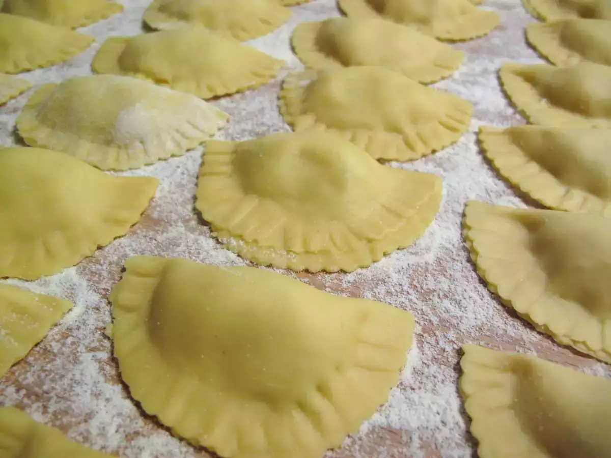 Si impasta bene fino ad ottenere una palla morbida e liscia e si lascia riposare avvolta da pellicola trasparente per circa mezz'ora. - Dopodichè si stende la sfoglia (se usate la macchinetta elettrica, fino alla posizione numero 5) e si taglia a strisce. Al centro di ciascuna striscia si dispone l'impasto facendo dei mucchietti alla distanza di circa 3 cm l'uno dall'altro; si ripiega la sfoglia avendo cura di togliere l'aria dai tortelli. Si taglia con il tagliapasta ogni raviolo e si chiude bene aiutandosi con una forchetta (io prima ho ricavato dei dischi tondi con la sfoglia e poi al centro di ogni disco ho messo l'impasto e ho chiuso la pasta formando una mezza luna che poi ho sigillato coi rebbi della forchetta).