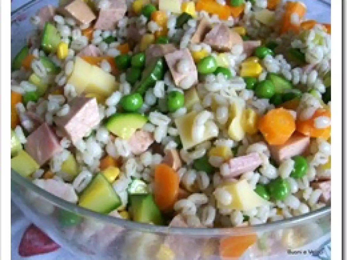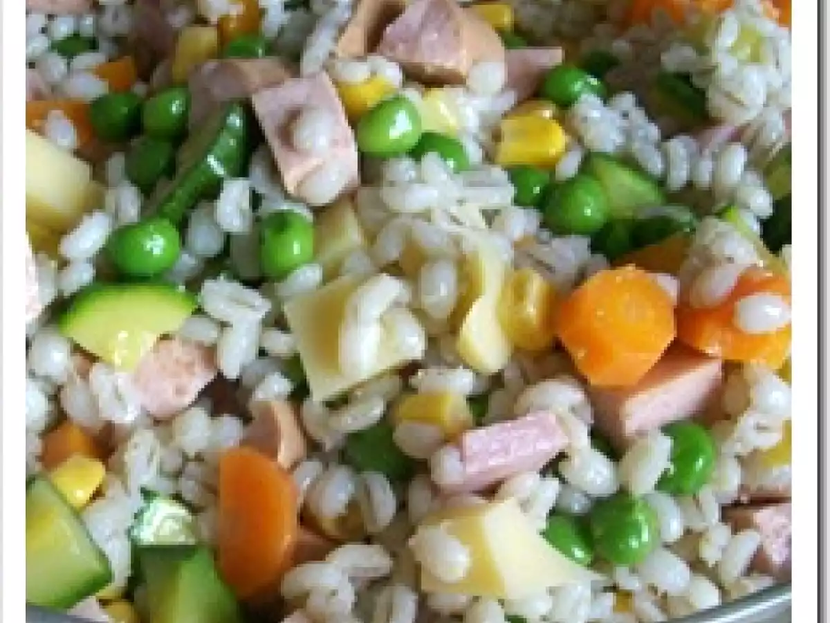 Insalata d?orzo con verdure fresche al vapore vota adesso PrecedenteProssimo Portata principalefacile1 ora Invia questa ricetta ad un amico Stampa la ricetta Contatta l'autore della Ricetta Pubblica la foto di questa ricetta Questa ricetta è molto gustosa. Ingredienti 6 250 g di orzo perlato 200 g piselli surgelati 250 g di zucchine piccole 200 g di carote piccole 160 g di mais in scatola 250 g di wurstel classici 200 g di emmenthaler sale olio extravergine di oliva un paio di foglie di basilico fresco (facoltative)