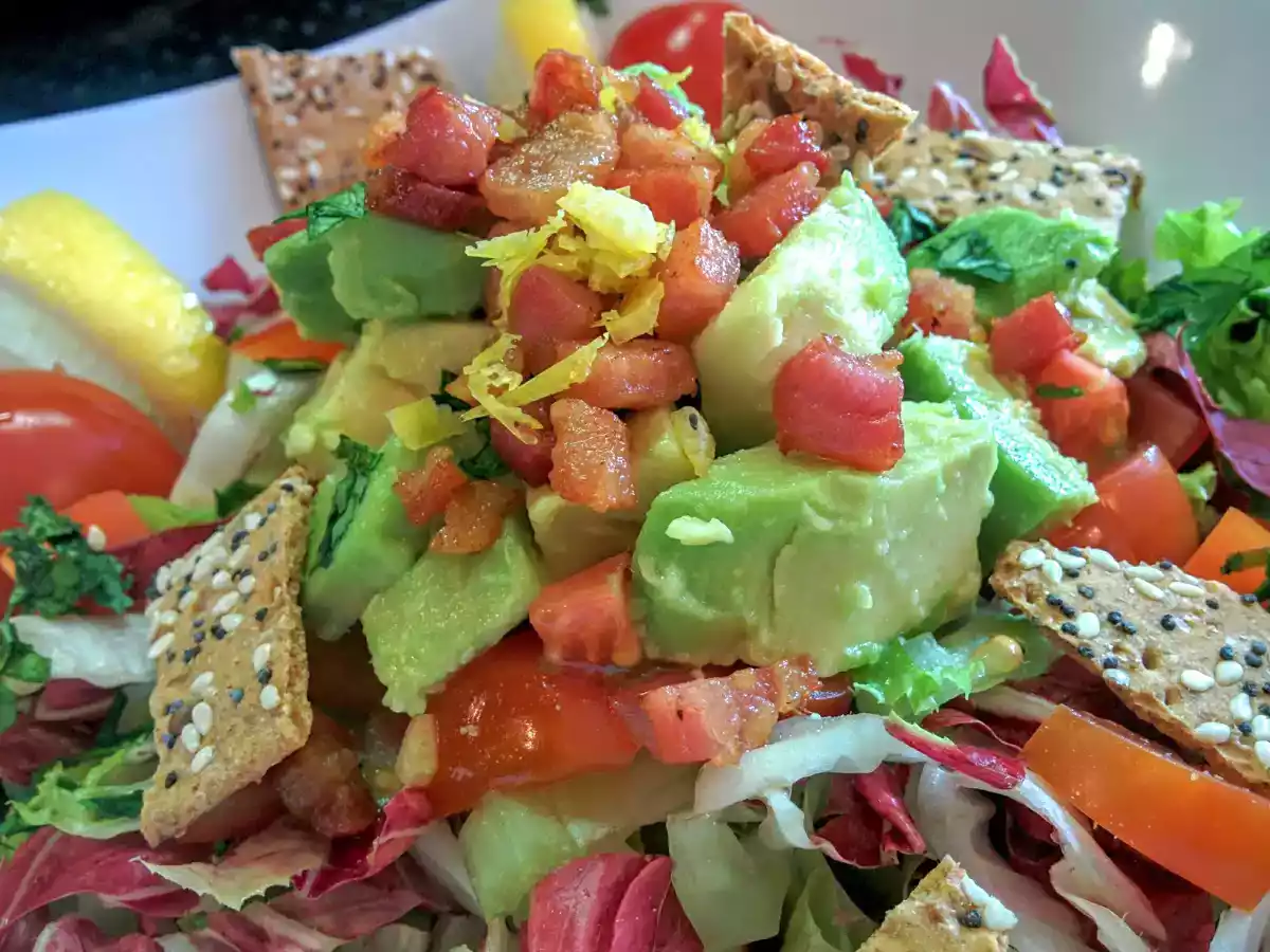Insalata di avocado con pancetta croccante e sfoglie di pane ai semi