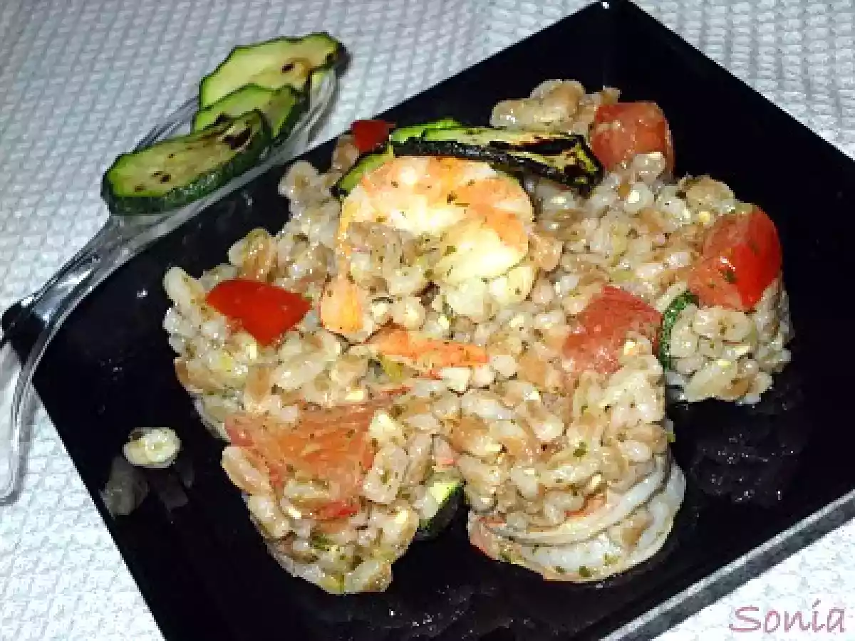 Insalata di farro al profumo di basilico con gamberi, pomodori e zucchine grigliate Portata principalefacile1 ora Invia questa ricetta ad un amico Stampa la ricetta Contatta l'autore della Ricetta Pubblica la foto di questa ricetta Ingredienti 4 300 g farro perlato 200 g gamberetti 2 zucchine 2 pomodori ramati 1 spicchio d'aglio due cucchiai di pesto senza aglio olio d'oliva timo prezzemolo sale, pepe