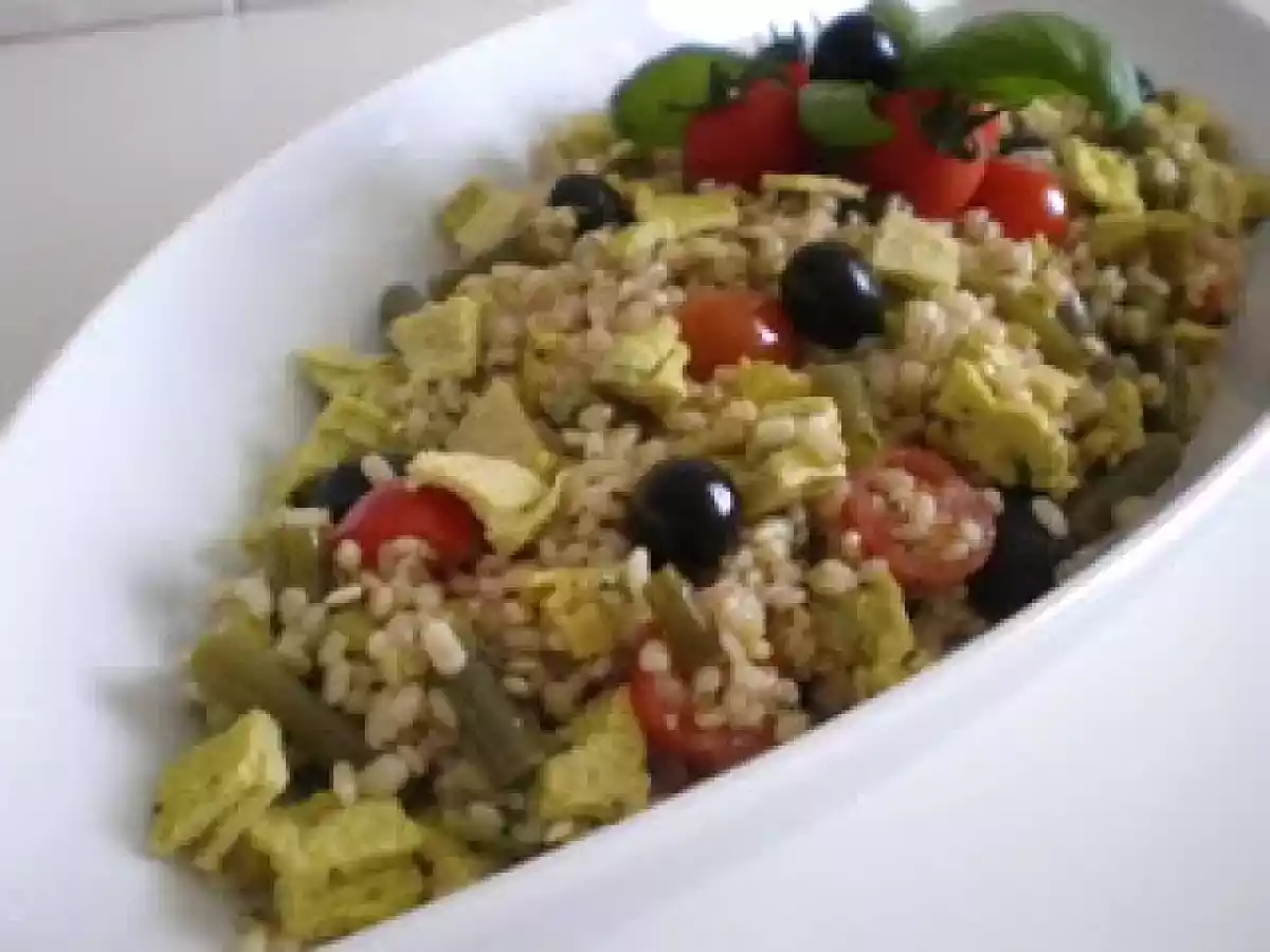 Insalata di orzo e frittata aromatica vota adesso PrecedenteProssimo Portata principalefacile1 h 15 m410 Kcal Invia questa ricetta ad un amico Stampa la ricetta Contatta l'autore della Ricetta Pubblica la foto di questa ricetta Ingredienti 4 300 g di orzo 2 rametti di origano fresco 2 mazzetti di basilico fresco 1/2 spicchio d'aglio privato dell'anima 2 rametti di timo 2 rametti di maggiorana 30 g di grana padano 4 uova 1 cucchiaino di dado bimby 150 g di fagiolini 15 pomodorini ciliegino piccoli 20 olive nere denocciolate sale Q.b. 50 g di olio Evo