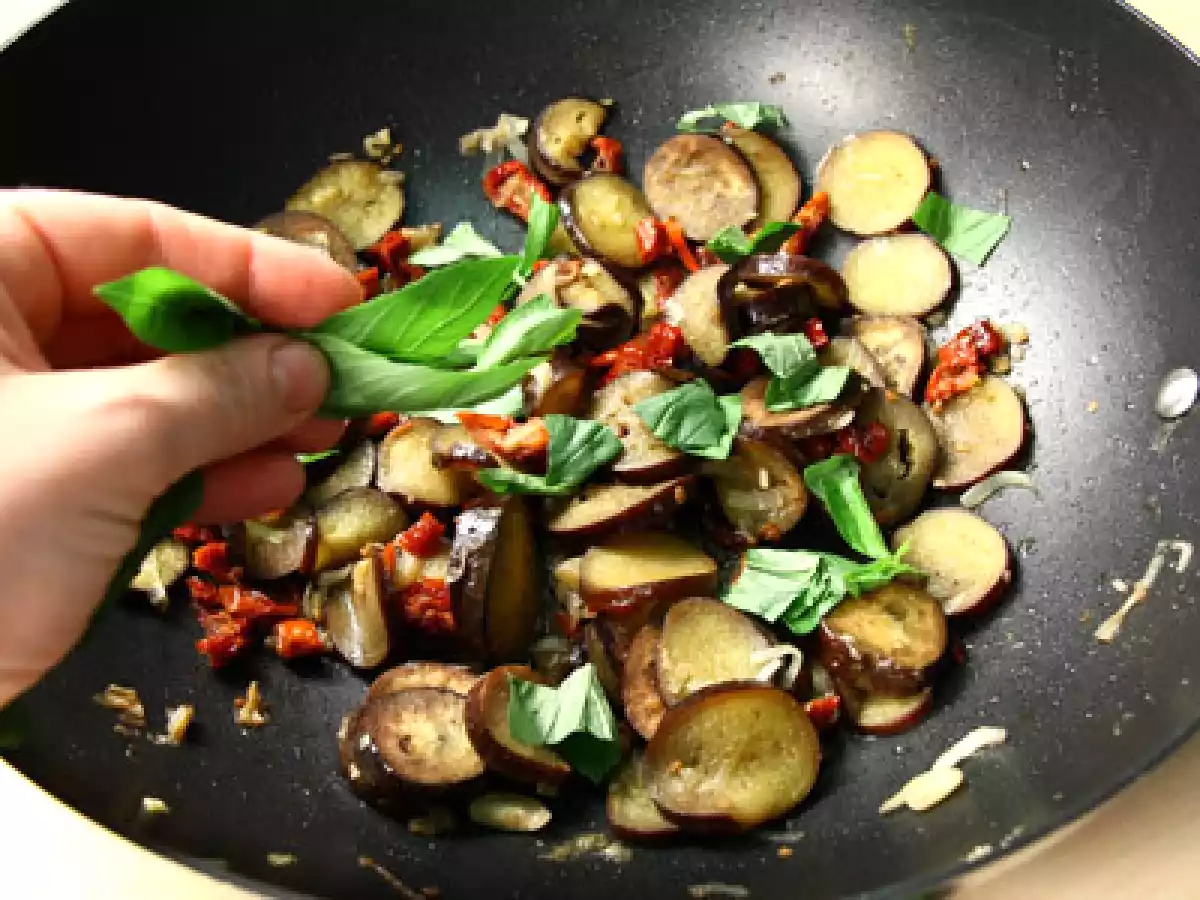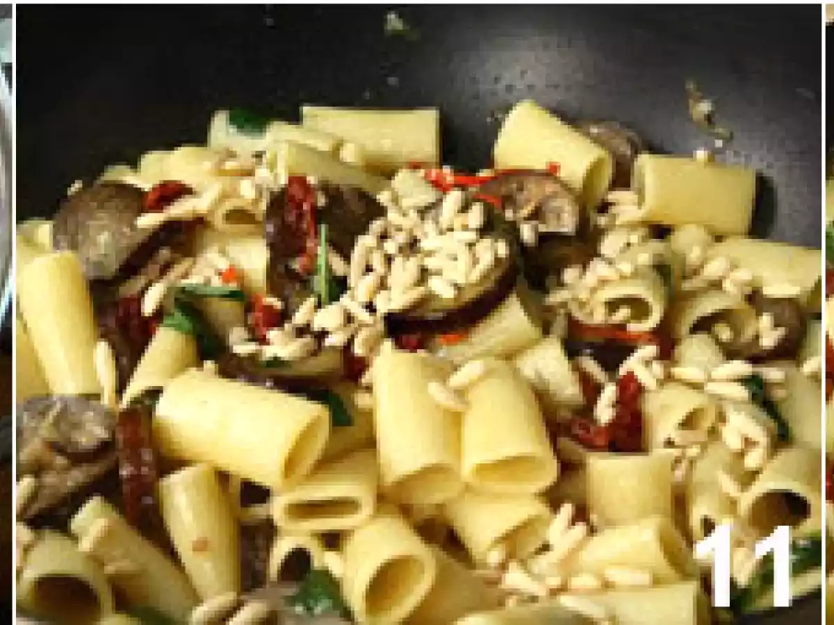 Insalata di pasta con melanzane e pomodori secchi PrecedenteProssimo Portata principalemedia30 min Invia questa ricetta ad un amico Stampa la ricetta Contatta l'autore della Ricetta Pubblica la foto di questa ricetta Ingredienti 4 Ingredienti Aglio uno spicchio Basilico 20 foglie Brodo 1 vaschetta di Cuore di Brodo Knorr Verdure Cipollotto fresco due Melanzane lunghe 300 gr Olio di oliva 4 cucchiai Peperoncino fresco metà Pinoli 60 gr Pomodori secchi 40 gr Ricotta salata grattugiata una manciata Rigatoni 400 gr