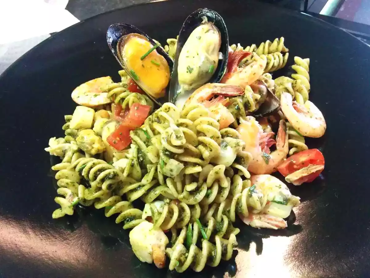 Pasta fredda con molluschi, gamberi pesto. Un primo gustososissimo