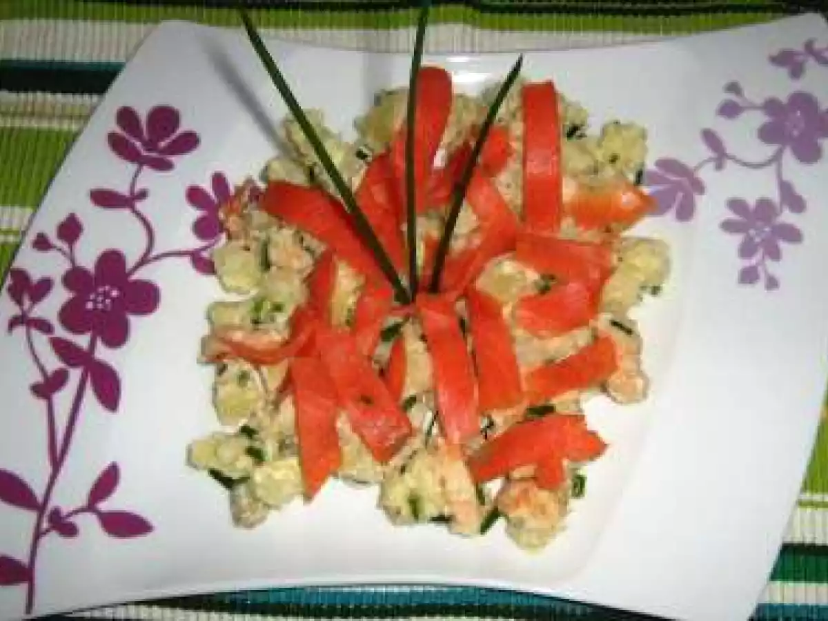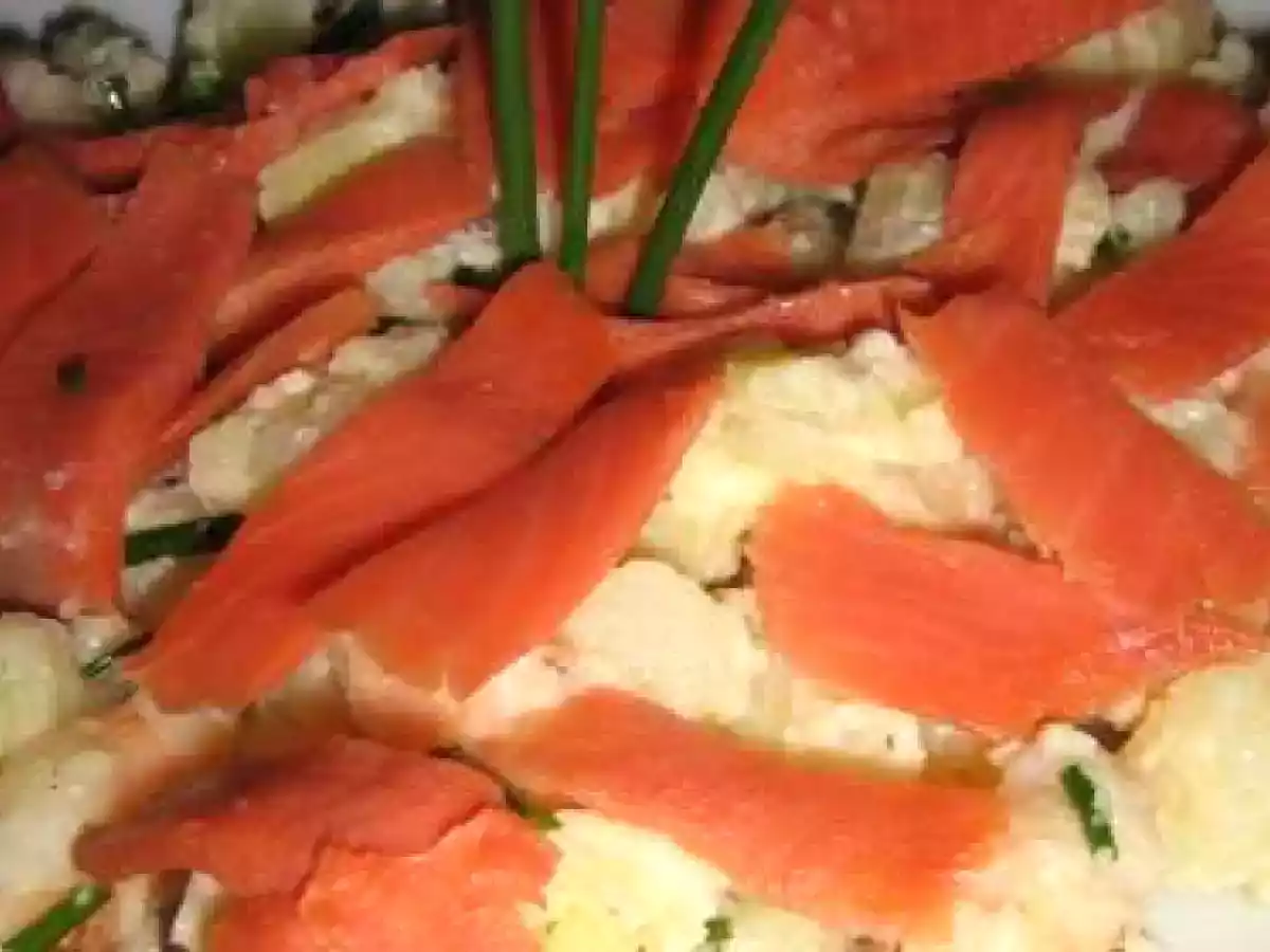 Insalata di patate saporita con salmone affumicato PrecedenteProssimo Portata principalefacile1 h 5 m Invia questa ricetta ad un amico Stampa la ricetta Contatta l'autore della Ricetta Pubblica la foto di questa ricetta Ingredienti 2 320 gr di PATATE LESSE 4 CETRIOLINI SOTT'ACETO 12 steli di ERBA CIPOLLINA 200 gr di CODE di MAZZANCOLLE 80 gr di SALMONE AFFUMICATO BRANDY Per la salsa: 2 cucchiai di YOGURT BIANCO MAGRO (NON dolce) 1 cucchiaio di CRESCENZA LIGHT 2/3 cucchiai di OLIO Extravergine di Oliva SALE "PEPE" SICHUAN