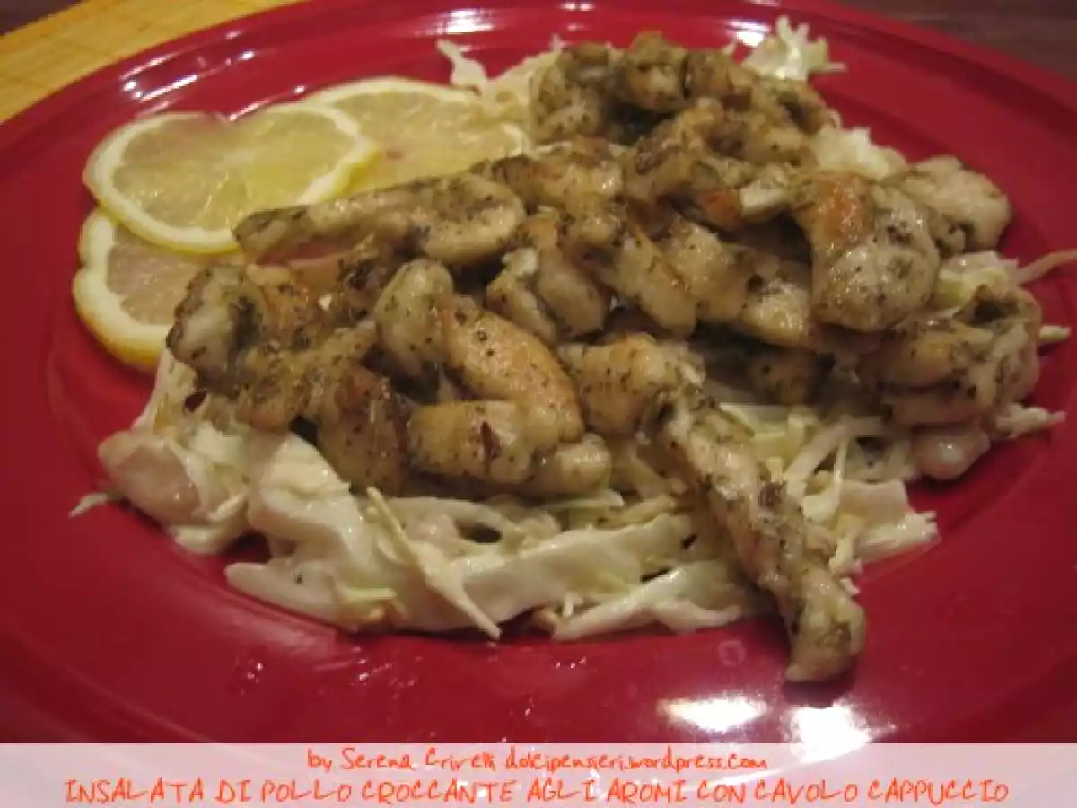 Insalata di pollo croccante agli aromi con cavolo cappuccio secondo ?dolcipensieri? PrecedenteProssimo Portata principalefacile55 min Invia questa ricetta ad un amico Stampa la ricetta Contatta l'autore della Ricetta Pubblica la foto di questa ricetta Ingredienti 8 1) 800 grammi di petto di pollo 1 cavolo cappuccio 140 grammi di fagioli cannellini 125 grammi di germogli di soia maionese q.b. olio extravergine d’oliva q.b. 1 noce di burro sale 1 limone 1 cucchiaino di dado granulare maizena q.b. 2) PER GLI AROMI : basilico, timo, salvia, rosmarino, origano, maggiorana, prezzemolo, coriandolo tritati 1 foglia di lauro 1 bacca di ginepro 1 spicchio di aglio rosa pepe nero sale
