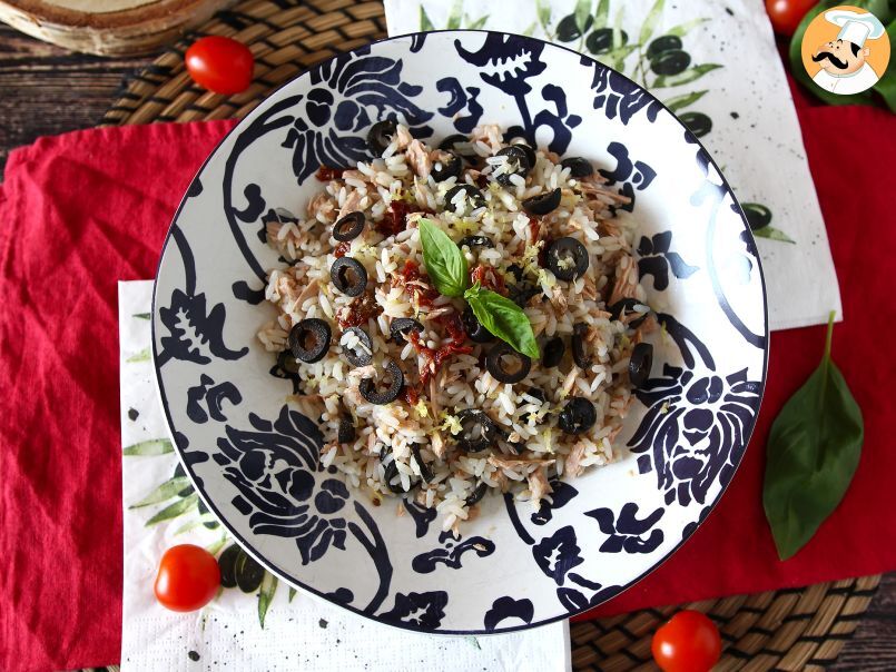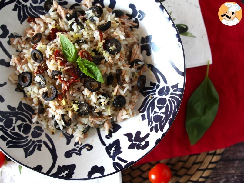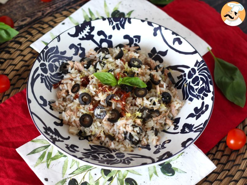 Fresca e profumata, sapore mediterraneo. Molti la chiamano anche insalata di riso Siciliana visto gli ingredienti che si usano per prepararla: tonno, pomodori secchi, limone, olive nere e olio extravergine (c'è chi utilizza anche le mandorle). Un abbinamento di gusto molto particolare che passa dai sapori intensi dei pomodori secchi sott'olio alle fresche note agrumate della scorza di limone grattugiata. Questa insalata di riso diventerà un'ottima compagna di viaggio della vostra estate, potrete portarla in spiaggia per un pranzo leggero e nutriente sotto l'ombrellone. Condividete la ricetta con i vostri amici e scriveteci nei commenti se vi è piaciuta!
