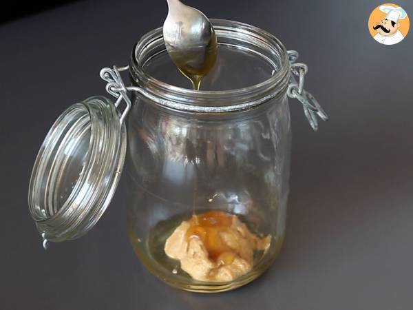 Mettete sul fondo del barattolo il burro di arachidi, l'olio di sesamo, il miele, il sale e il pepe. Mescolate bene.