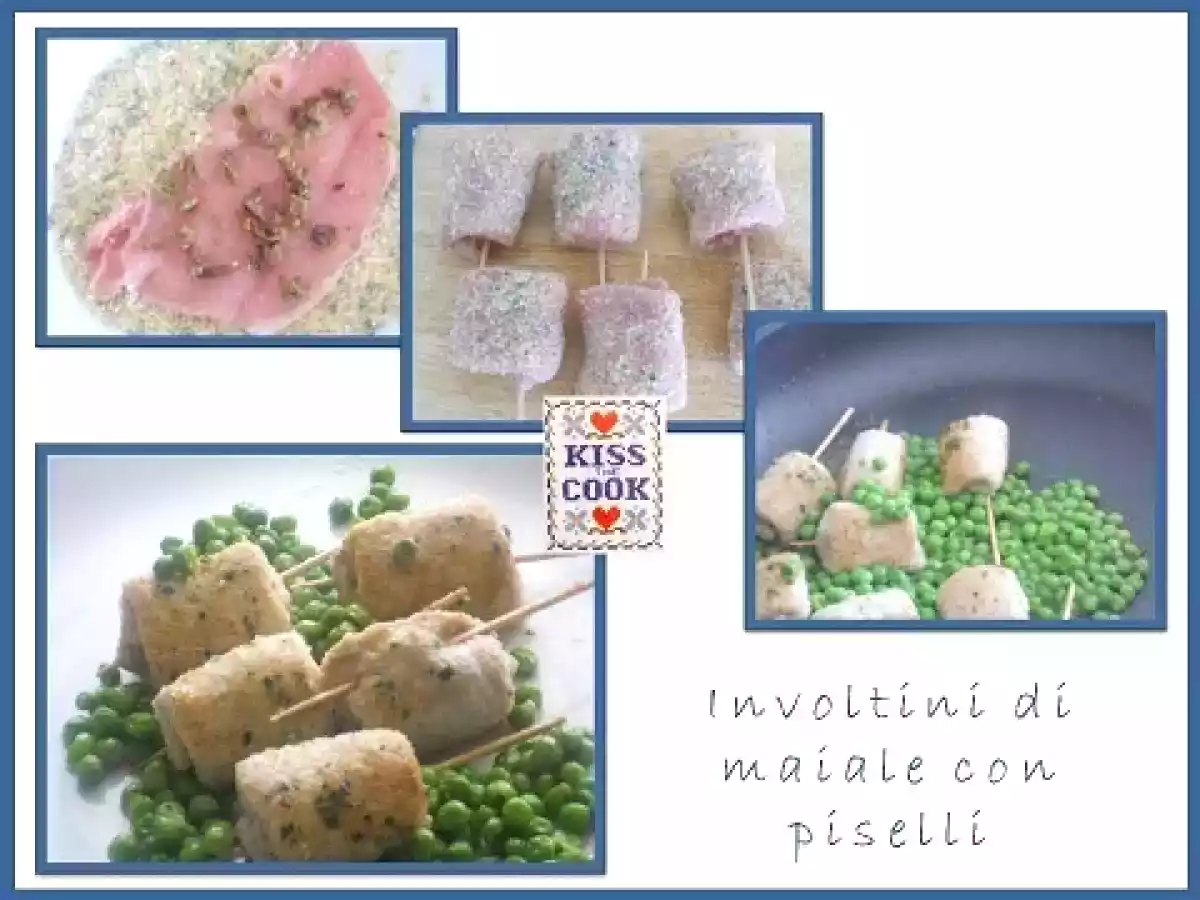 Involtini di maiale con piselli Portata principalefacile35 min Invia questa ricetta ad un amico Stampa la ricetta Contatta l'autore della Ricetta Pubblica la foto di questa ricetta Ingredienti 4 Ingredienti per 4 persone: una decina di fettine di lonza di maiale 10/15 olive 2 cucchiai di capperi 4/5 cucchiai di pane grattugiato 4/5 cucchiai di parmigiano 2 cucchiai di prezzemolo olio 300 g ca. di piselli sgusciati sale.