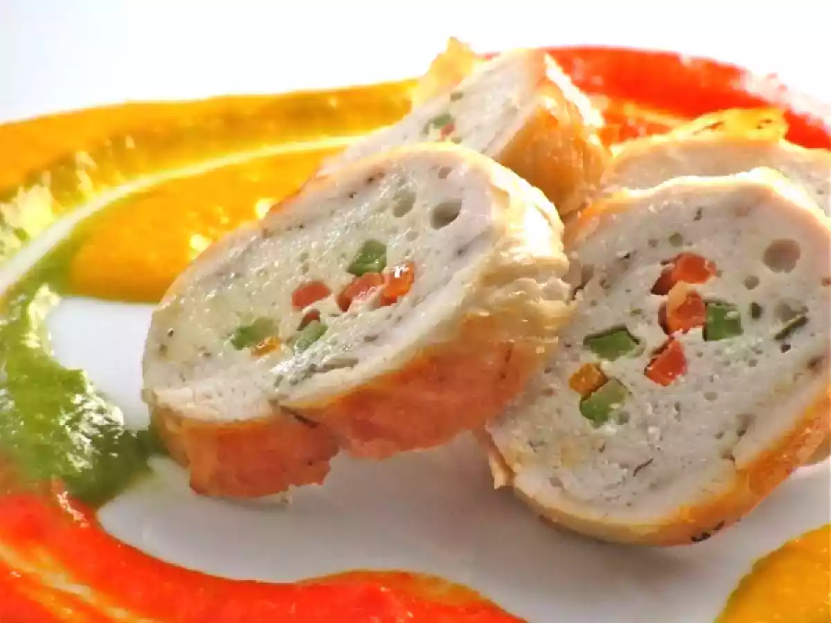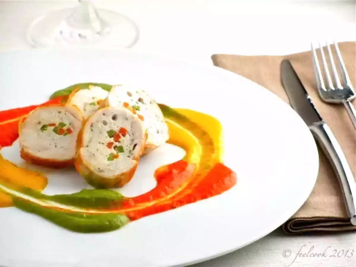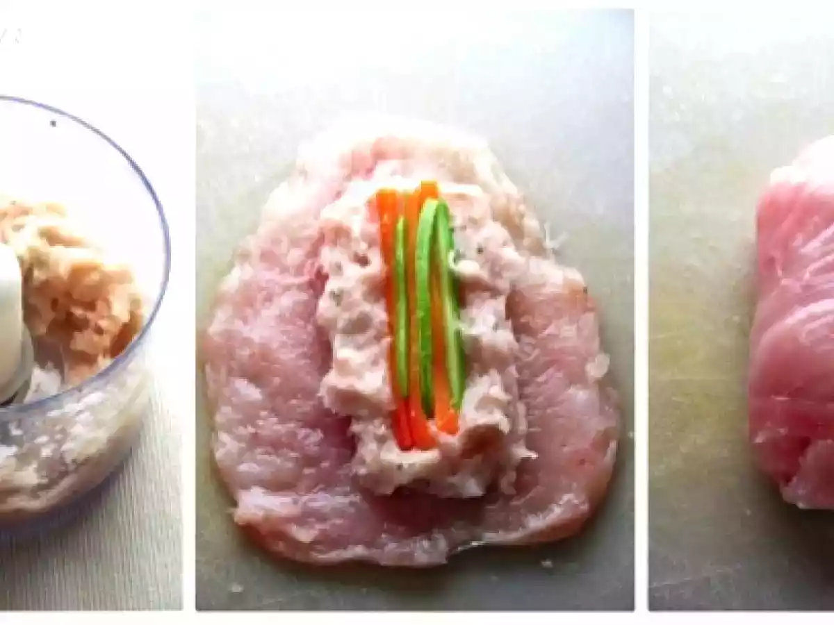 Involtini di pollo ai peperoni PrecedenteProssimo Portata principalemedia1 h 20 m Invia questa ricetta ad un amico Stampa la ricetta Contatta l'autore della Ricetta Pubblica la foto di questa ricetta Una deliziosa ricetta per preparare il pollo Ingredienti 4 2 petti di pollo interi 1 zucchina 1 carota 1 albume 1 peperone rosso 1 peperone giallo 1 peperone verde 1 spicchio d'aglio 1 rametto di rosmarino 1 rametto di timo olio EVO q.b. sale e pepe q.b.