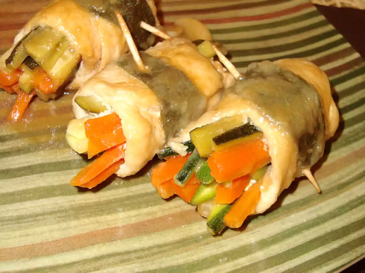 Involtini di pollo alle verdure PrecedenteProssimo Portata principalefacile35 min Invia questa ricetta ad un amico Stampa la ricetta Contatta l'autore della Ricetta Pubblica la foto di questa ricetta Ingredienti 2 3 fette di petto di pollo spesse o 6 fette sottili 3 fettine di speck 1 zucchina 2 carote 6 foglie di salvia 1 noce di burro 1 spicchio d'aglio 1 pò di vino bianco 1/2 misurino di brodo granulare di farina sale e pepe a piacere