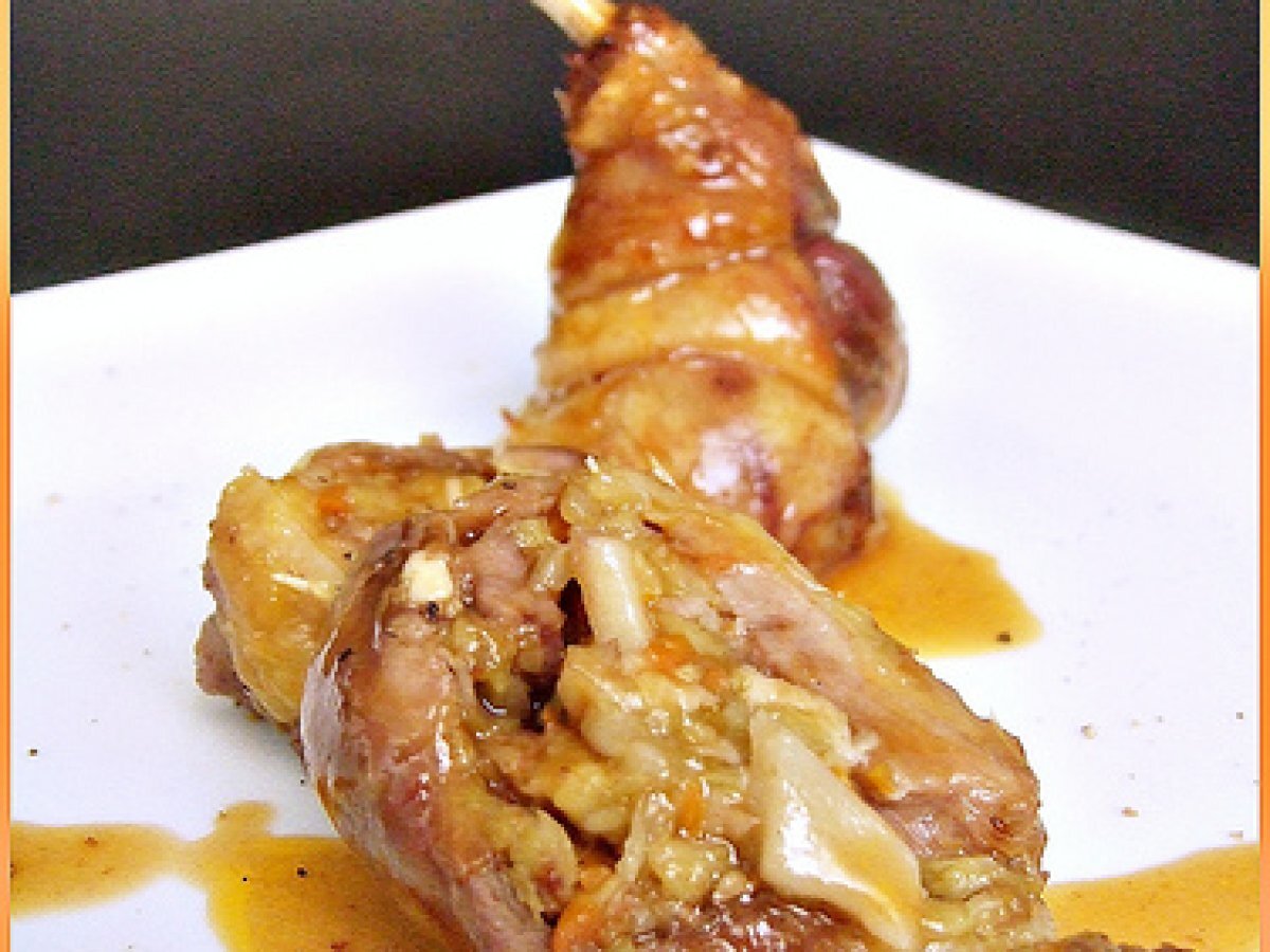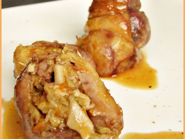 Battete un pò le cosce adagiatevi dentro un pò di farcia e legate con spago da cucina.Fate cuocere in forno a 200 ° per una ventina di minuti,lasciate poi riposare 5 minuti prima di tagliare le cosce irrorate con la demi e servite con purè di mele e sedano rapa o con quello che preferite ;-) - Infarinare le ossa metterle in una leccarda passarle in forno per 30 minuti a 200° .